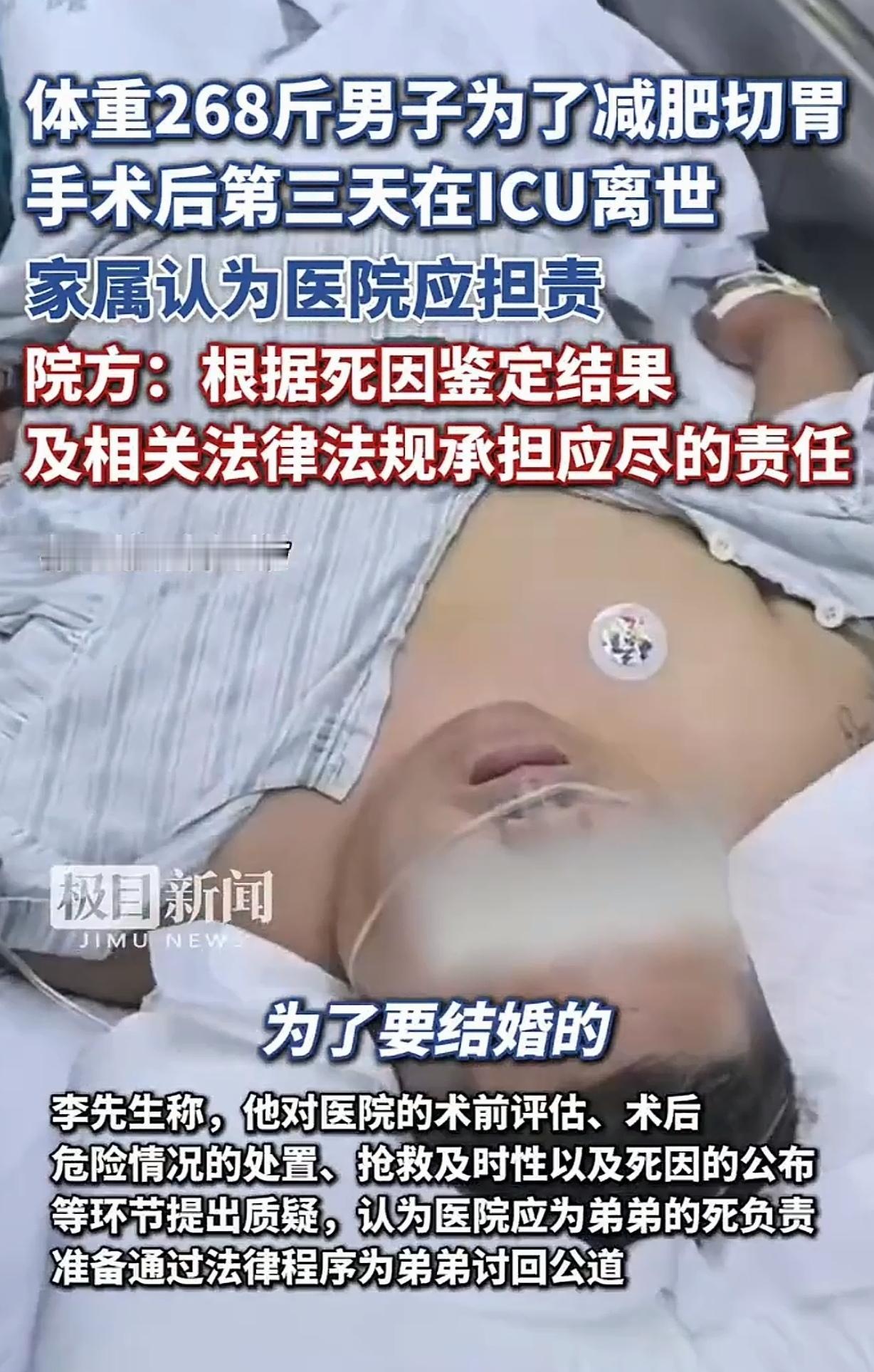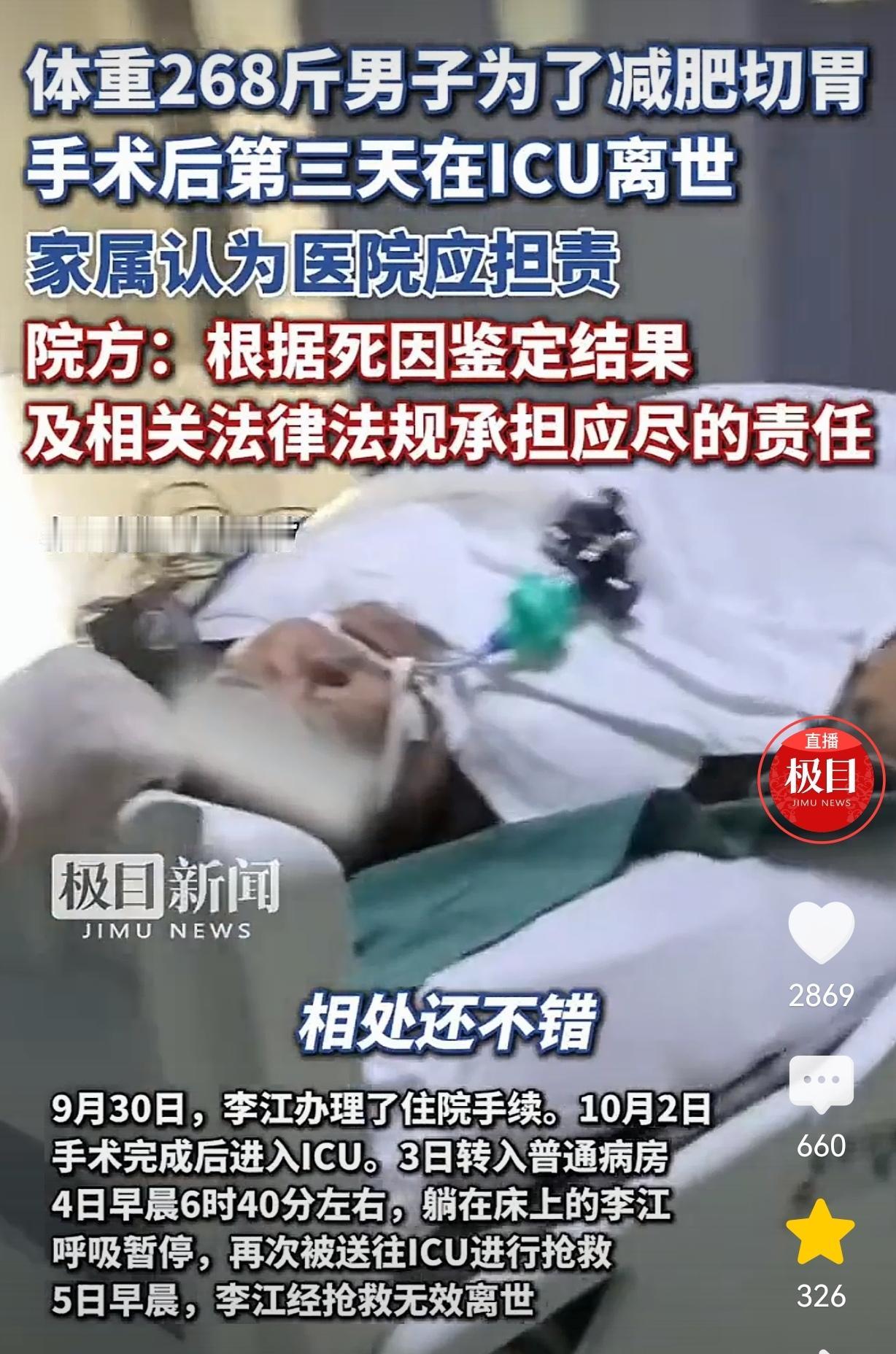 河南郑州,一36岁男子重268斤,好不容易找了个对象,他怕对象父母嫌自己胖,在见女方家长前,他准备减减肥,把形象弄好点,就去医院做切胃手术,可万万没想到,他从lCU转入普通病房才2天,竟然没气了,抢救无效身故。家属痛哭流涕,要求医院承担责任,而医院却说:根据死因鉴定结果,以及相关法律法规承担应尽的责任! 李江36岁了,这个年纪早就为人夫为人父了,可他还是一人吃饱全家不饿。 因为李江太胖了,重达268斤,这个体重行动不便,无法正常工作和生活,哪个女孩子愿意以身相许呀! 看着儿子的同龄人,孩子都能打酱油了,儿子却孤身一人,李家父母愁肠百结,托亲戚朋友给儿子张罗对象。 还好,有个女子跟李江一见倾心,相处生情,两人随后确定了恋爱关系,到了见家长的地步,可李江却犯了难。 以前,他不是没想到减肥,控制体重可管住嘴迈开腿,他那一样都做不到,任由体重飙升。 如今不一样了有女人不嫌弃自己胖,愿意和自己喜结连理,百年好合,他也必须得努把力。 因为,即使女朋友不嫌弃自己,可人家父母就不一定了,谁愿意把女儿嫁给一个胖的走路都气喘吁吁,举步维艰,行动不便,大腹便便的胖子? 而且,过度肥胖,不仅形象不好,还有健康隐患,说不上啥时候就噶了,想白头偕老都难,当父母的,肯定不愿意自己女儿随时守寡。 思来想去,李江决定在见女朋友家长前,管理一下体重,把形象弄好一点,否则,女友父母如果对自己印象不好,说几句不好听的,可能这段恋情就告吹了。 但短时间内,想要减重,比登天还难,唯一可行的,就是去医院做切胃手术。 李江决定去医院做切胃手术,就算不为了婚姻,为了以后的身体健康,也是值得的。 2025年9月30日,李江办了住院手续,经过各项检查后,他10月2日,被推进手术室。 手术进展顺利,他被送到进行lCU观察,没有异常后,第2天,也就是10月3日,他被转入普通病房。 可万万没想到,就在李江耐心等待痊愈出院时,4日早晨6时40分左右,他突然呼吸暂停。 李江被紧急送进lCU,可经过一日一夜的抢救,他还是抢救无效离世。 李家父母悲痛欲绝,儿子好不容易找了个女朋友,眼瞅着就要谈婚论嫁了,没想到竟然遭遇不测。 悲痛的李家父母,把矛头指向医院,要求医院承担责任。 李江的哥哥说,他对医院的术前评估,术后危险情况的处置。抢救不及时,以及死因的公布等环节,都提出了质疑,认为医院应该为弟弟的死负责,弟弟不能白死,准备起诉医院。 而医院却说,李江术前进行检查,对方做切胃手术的条件,没有手术禁忌,发现李江不对劲后,医院也没延误抢救,抢救过程中,也没任何失误。 既然李家人追究责任,那就对李江进行死因鉴定,根据结果,还有相关法律法规,如果医院应该承担责任,医院绝不推卸。 切胃,胃一旦被切除,不管是部分切除还是全切,身体进入一个全新状态,像被迫开启“重设模式”。风险有多大? 何必为了减肥遭这罪,活生生把命搭进去了!太可惜了!去荒野求生啊,一个月瘦一百斤不是简简单单。 胖子不管男女,减肥要是吃约,或者手术减肥,去医院减肥,这都是错误的选择,愚蠢的人。减肥最好最快的办法就是去建筑工地干活,三个月左右就可以给你减掉20到30斤左右,工地干活还挣钱,还减肥,一举两得。 260多斤,在正常人当中算胖的,在胖子当中真不算胖的,正常的靠饮食锻炼运动就能达到减肥的效果,为啥要去切胃手术? 不知道会为什么会出现这样的问题?找对象是正常的事情。胖可以减肥。只要有决心,我相信用不了一年都可以减100多斤,但你不想减那没办法,但用切位这种方式,我觉得是最不可取的。 《民法典》第1218条规定:患者在诊疗活动中受到损害,医疗机构或者其医务人员有过错的,由医疗机构承担赔偿责任。 《民法典》第1219条规定:医务人员应履行告知义务,如手术风险、替代方案。 若医院未充分告知李江“术前合并重度睡眠呼吸暂停综合征”等特殊风险,或未说明术后呼吸管理的重要性,则可能违反告知义务。 术前评估,是否充分识别李江的高血压、高血脂、重度睡眠呼吸暂停综合征等合并症,评估手术耐受性; 术后监护,ICU转普通病房仅1天后突发呼吸暂停,是否过早降低监护等级? 抢救及时性,呼吸暂停到抢救的响应时间、措施是否规范? 医院如果主张免责,需证明其诊疗行为与李江死亡无因果关系,或存在以下情形:患者自身健康原因,如重度肥胖、呼吸暂停综合征直接导致呼吸衰竭;现有医疗水平限制,如突发并发症无法预见或避免。 但如果死因鉴定显示抢救措施不当,如未及时气管插管,加速死亡,医院仍可能担责。 如果责任成立,医院需赔偿医疗费、丧葬费、死亡赔偿金,精神损害赔偿。 关注@灋律盐究员 学法辩是非,用法止纷争。