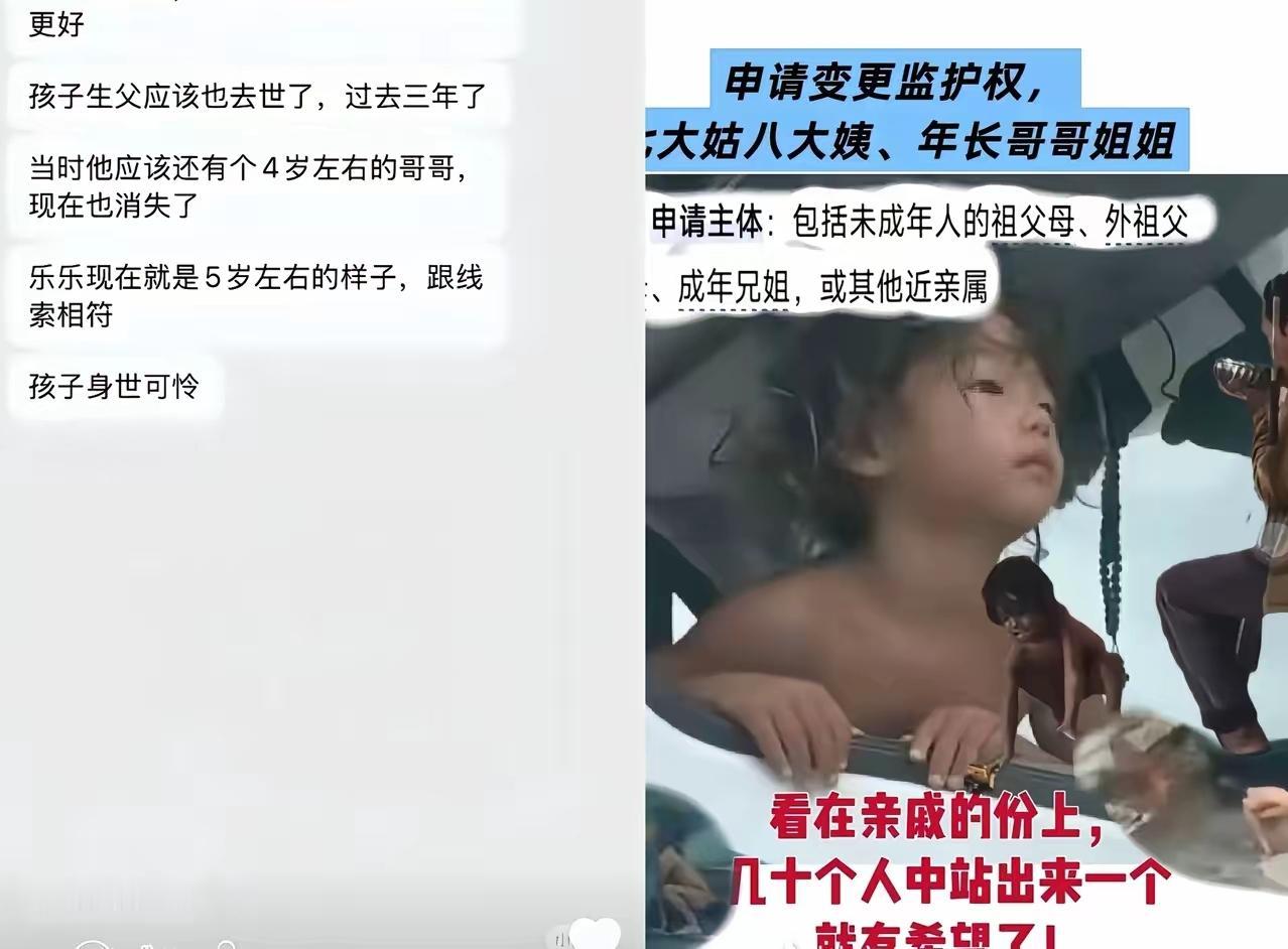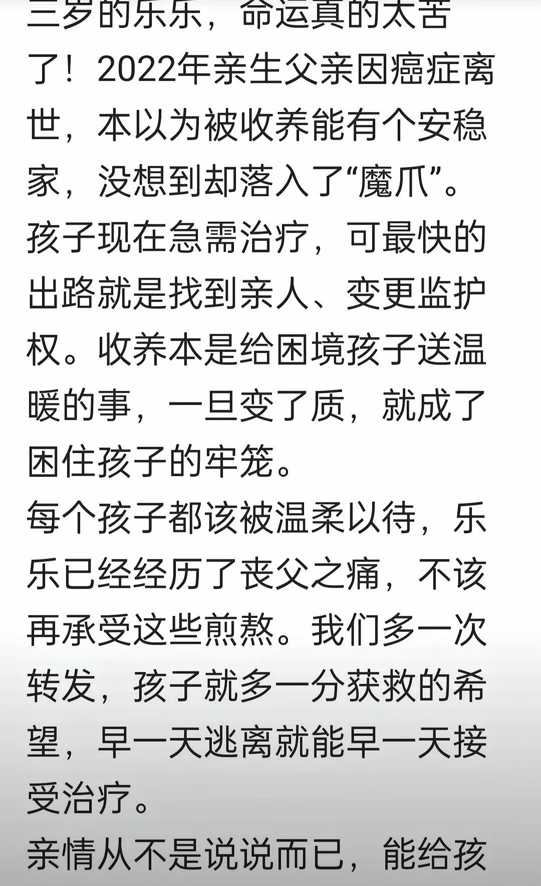 乐乐真的被解救了吗?网上说的不是空穴来风,原来乐乐真的不是亲生的。 乐乐的父亲是在2022年因为癌症去世了,之后乐乐就被养父母收养,现在的监护权是在他们手里。 作为亲生骨肉,哪个家长能狠下心来让自己的孩子不穿衣服,还学犬爬,用嘴叼食。 原来之前发生的一切,被网友看到的画面都是有迹可循:说什么湿疹不给穿衣服,孩子不愿意穿,原来就是纯粹的不给穿。说什么自然养育,怀抱里的孩子怎么不自然养育。其实北京的姥姥早就知道这件事,又不怎么舆论大了才给上户口。 现在孩子监护权在养父母手里,要想更改监护权只有找到乐乐的亲人,并愿意收留他才可以,目前的情况真的很让人束手无策。 世上只有妈妈好,有妈的孩子像个宝。没了亲生父母,乐乐真的是太可怜了,现在的犹如一艘小船,独自在海上漂流一样,经受着养父母的折磨,帮帮乐乐吧,怎么样才能逃离养父母。
