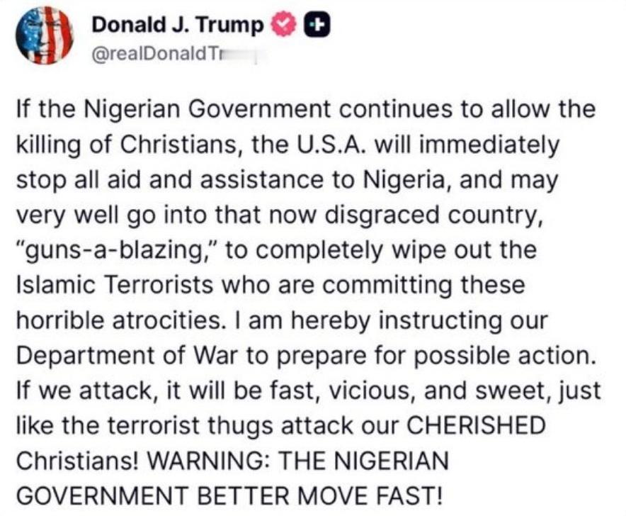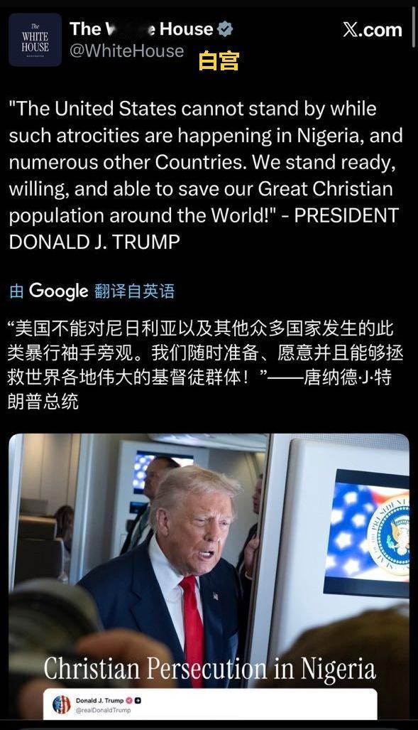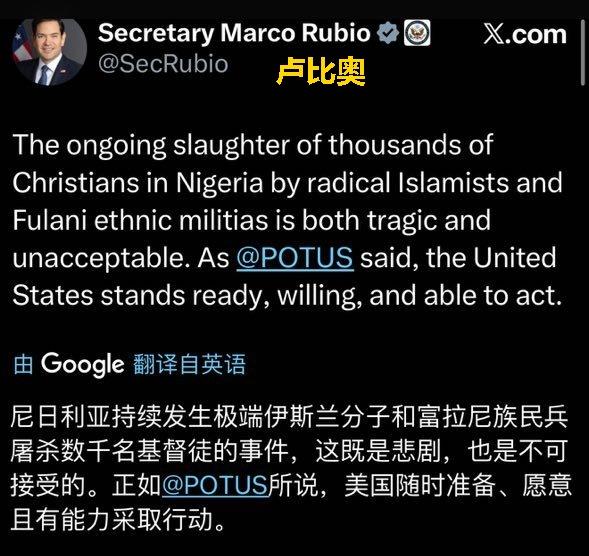 卢比奥转发了老川关于尼日利亚恐怖分子屠杀基督徒的警告帖子。(图1) 尼日利亚极端伊斯兰分子屠杀基督徒的事件,让老川很是愤怒。他警告尼日利亚政府最好迅速采取行动制止暴行!否则美国不仅将立即停止对尼日利亚的所有援助,还可能会“以雷霆之势”介入,消灭那些正在犯下可怕暴行的伊斯兰恐怖分子。 美国这种警告,是负责任的大国风范?还是干涉他国内政?你评判一下。
