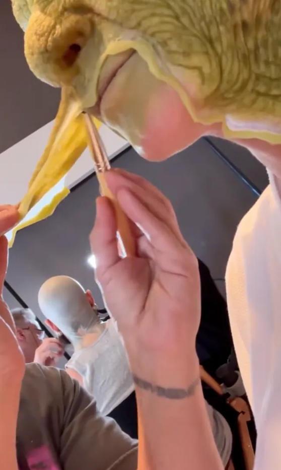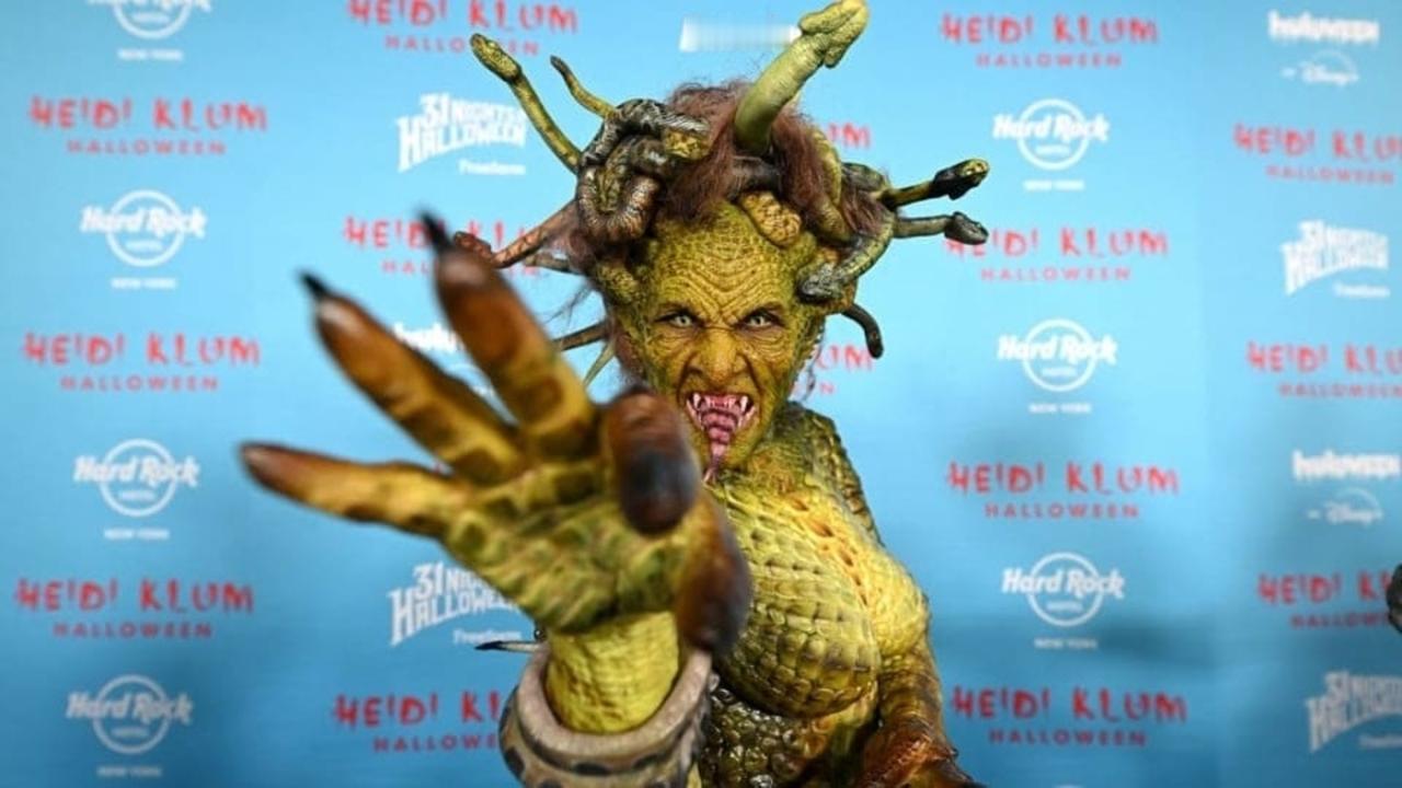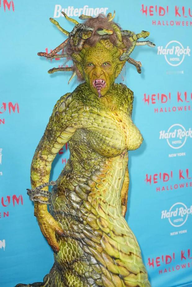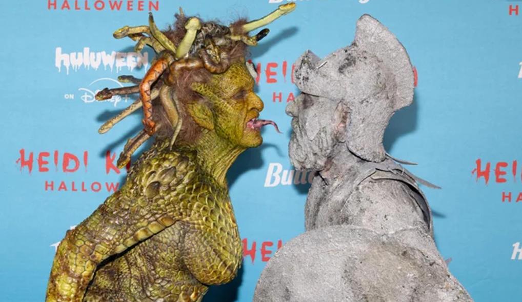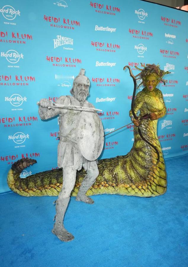 万圣节女王海蒂·克鲁姆今年也不负众望,扮成了美杜莎,从头到脚覆盖一身发光的绿色鳞片、獠牙闪着寒光,头顶 “盘踞” 着一群能活动的蛇。 她老公也没闲着,为了配合老婆戏码,扮成被美杜莎石化的士兵,全身灰白,还有裂纹妆。海蒂放出幕后花絮,展示妆容是怎么一步步完成的,不过普通人应该模仿不来——毕竟她的万圣节造型,是大名鼎鼎的仿生妆大师迈克·马里诺打造的,这位可是给《企鹅人》做特效妆的好莱坞大神。