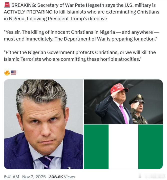 “对在尼日利亚——以及任何地方——S害无辜基督徙的行为,必须立即终止。战争部正在为行动做准备。”