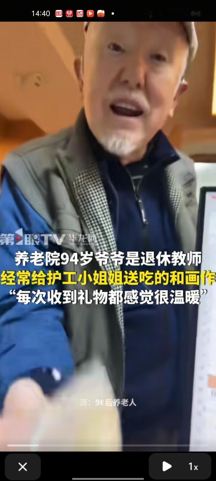 10月31日,四川成都。养老院94岁爷爷是退休教师,经常给护工小姐姐送食物和画作。 王女士介绍称,爷爷平时喜欢写字、看书、画画,特别热爱生活,对工作人员特别好。爷爷很有爱也很有才华,每次收到他的礼物都感到开心,特别温暖。