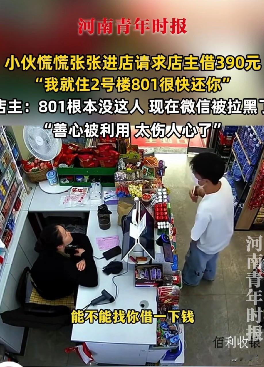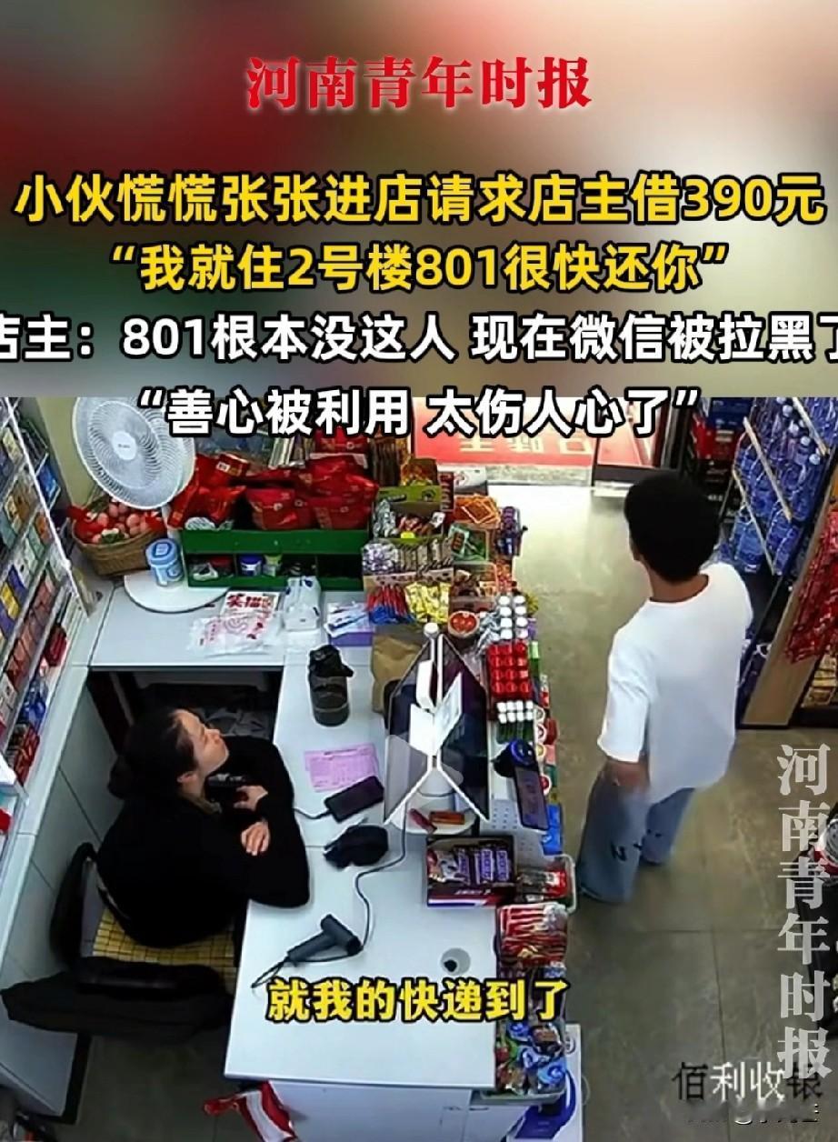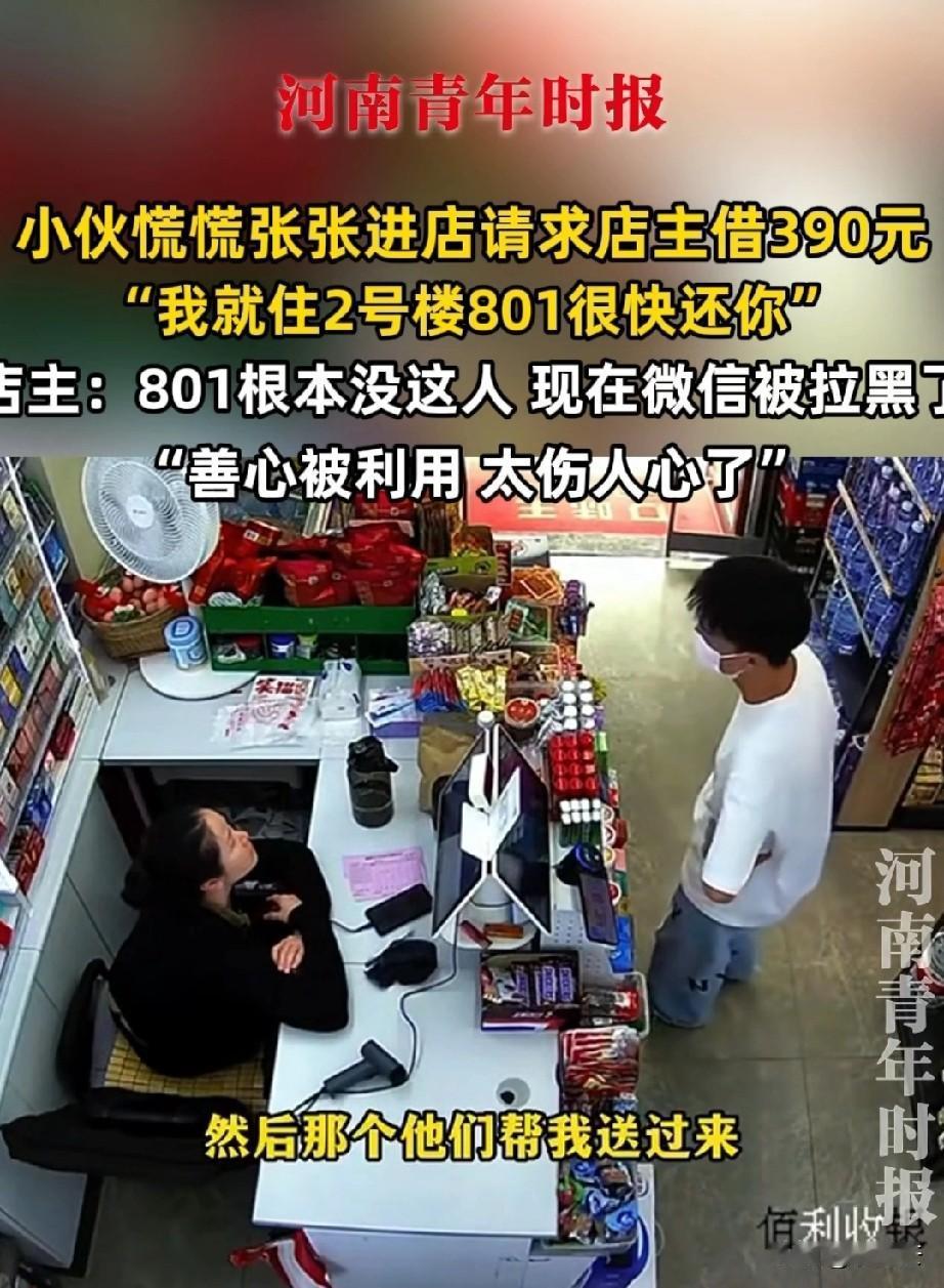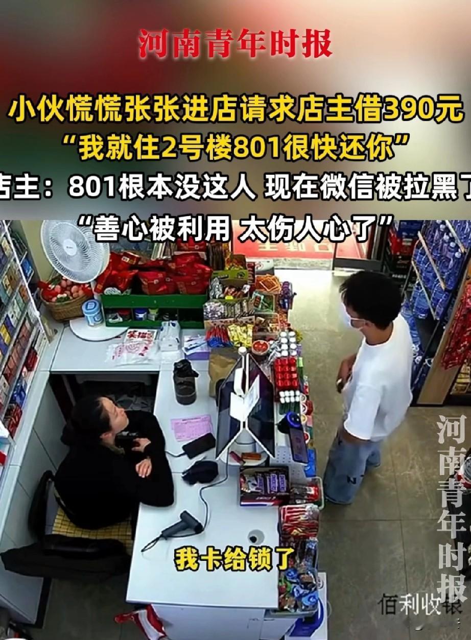 “真缺德!”福建一超市女店主发视频,一个年轻小伙戴着口罩慌慌张张跑进店里,说买了两袋猫粮,快递是到付。但是自己卡锁了没法付钱,借了店主390,甚至还自报家门,2号楼801的,加了微信承诺等会立即给转。结果13号借的钱,27号还没还,小区根本没这个人,微信也被对方拉黑! 店主说感觉好像有些印象,他说的也很真实,不想是那种老赖,当时没有多想,小伙子很着急来借钱,店主就给他扫了390。 结果一直也没等他来还钱,女店主发微信问他,说是27号才能转账,从13号一直等到27号也没给,后来又说银行一周以后钱才能到账,再到后来发微信给他,发现已经被拉黑了,因为当时没留手机号,所以也找不到联系方式。 女店主去了他说的2号楼801,那家根本没这个人,女子说善心被利用,真的太伤人心了。 就是因为这种骗子太多了,所以导致大家都不敢出手帮忙,利用别人的善心,还说是猫粮,为了390块钱还真能忽悠,就怕遇见这样的,以后谁还敢发善心!