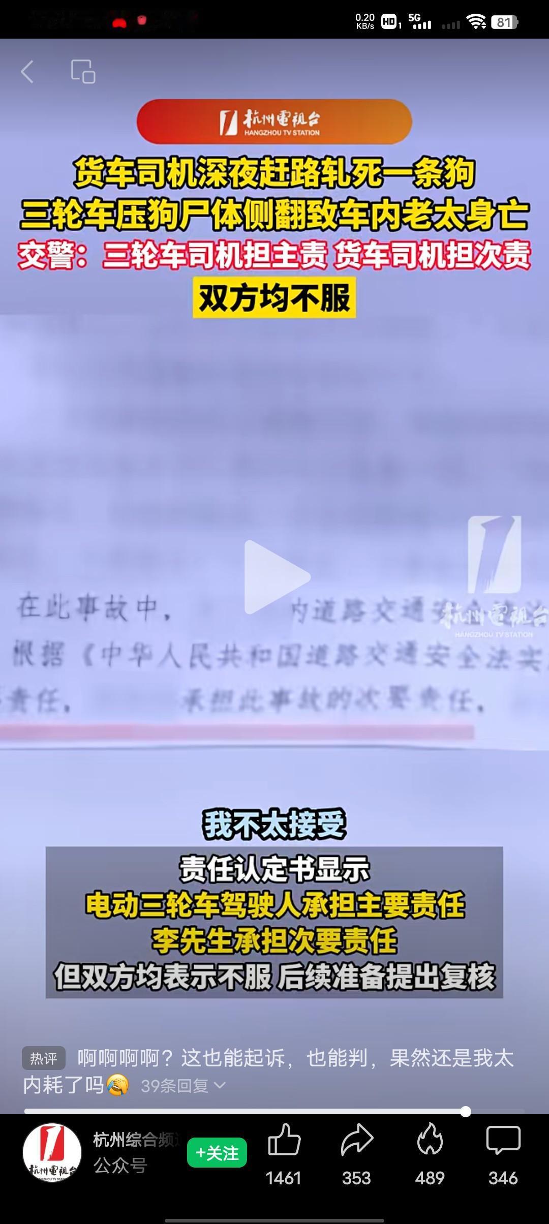 你绝对没听说有双方都不服的交通事故判决。货车压死了一条狗,狗的尸体引发的二次事故致人死亡的交通事故,这样一个事故该如何判决呢? 今年9月货车司机李先生深夜赶路压死一条狗,据李先生说,当时觉得车子咯噔一下,好像压倒了东西,也没下车看就开走了。没想到第二天一早,就接到交警的电话,才知道当时压死了一条狗,而狗的尸体又引发另一起交通事故。 当天凌晨两点有人骑着电动车压到了躺在路中间的狗的尸体上,造成电动车侧翻,车上一位71岁老太太死亡,狗无人认领,造成李先生的扯被扣。交警判定,电动三轮负主要责任,李先生负次要责任。李先生对这个判决有异议,觉得自己是遭受飞来横祸,决定上诉,老太太家属对此判决也有异议,如果他没有压死狗老太太不会死。 那么这个案子具体该怎样判决才合情合理呢?