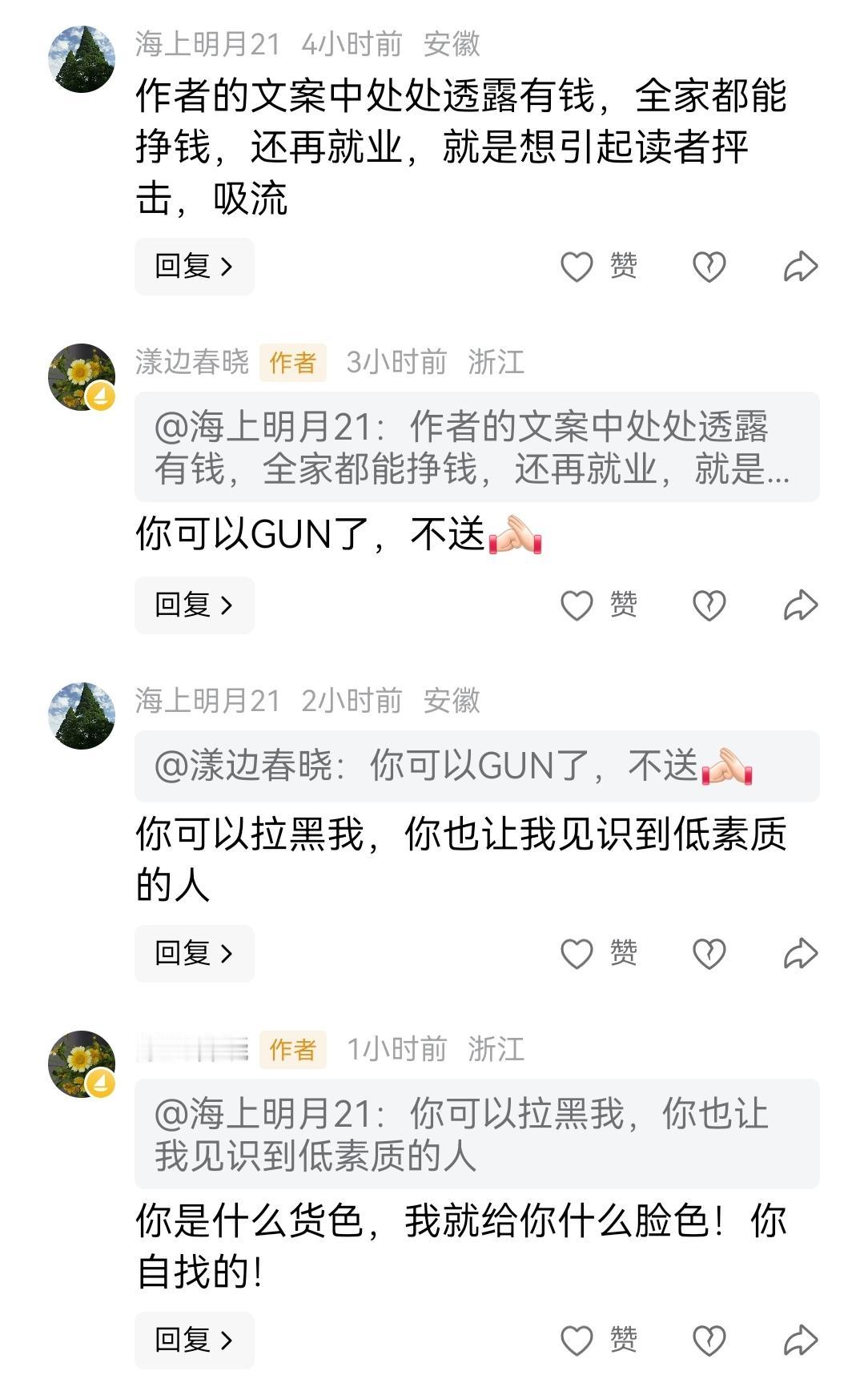 有人在评论区出言不逊,该反击吗? 我昨天写了一篇李姐退休后闲不住,又应聘挣钱的微头条。今天早上看到有人给我评论:“作者的文案中处处透露有钱,全家都能挣钱,还再就业,就是想引起读者抨击,吸流” 我的妈呀,这什么人?不喜欢看我文章划走啊,拉黑我也可以,这番话啥意思?我豪不客气地回复:“你可以GUN了,不送。” 他可气坏了,说我是低素质的人。我马上反唇相讥:“你什么货色,我就什么脸色!你自找的。” 头条是个大社团,大家你敬我我敬你,才能健康文明地发展下去。既然他不识趣在先,我就没什么好客气的。 请问大家支持我吗?