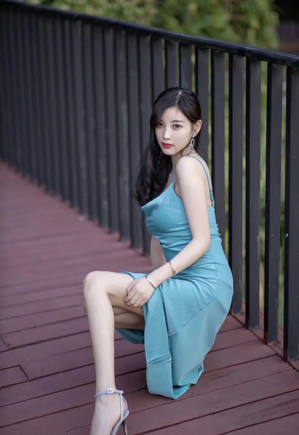 优雅蓝裙,红唇轻启,静坐木桥,尽显迷人风情。