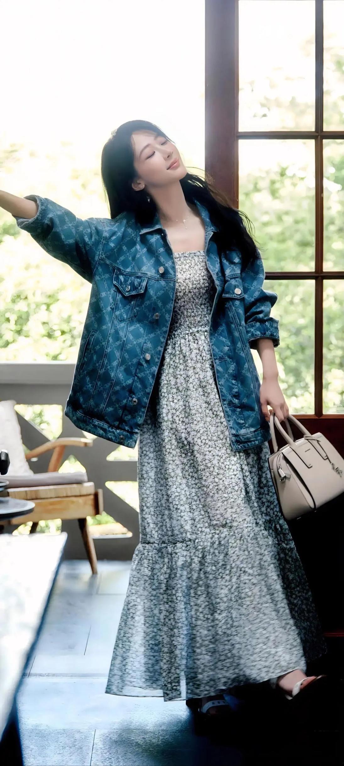阳光洒进来的午后,牛仔外套搭配印花裙,轻松自在。