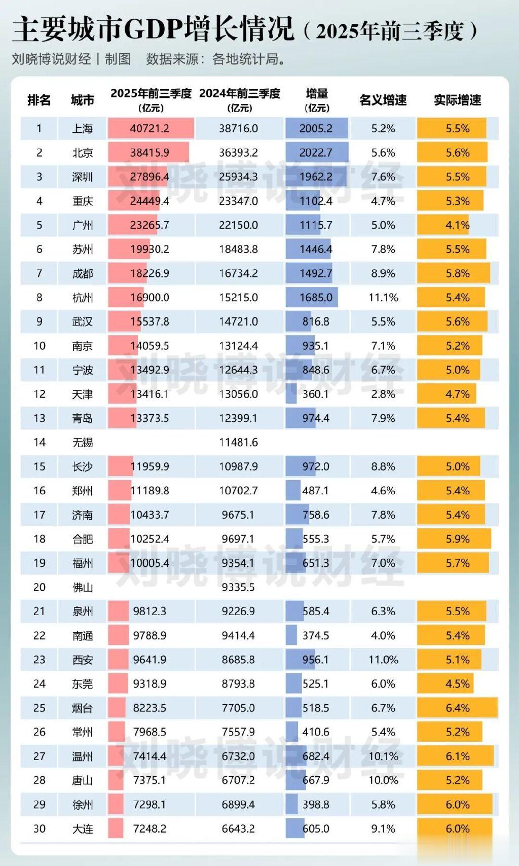 各地经济三季报正在公布中,到目前为止内地GDP前30名城市中,已经有28个公布了数据。哪些城市增长强劲,哪些城市较弱?请看数据:
