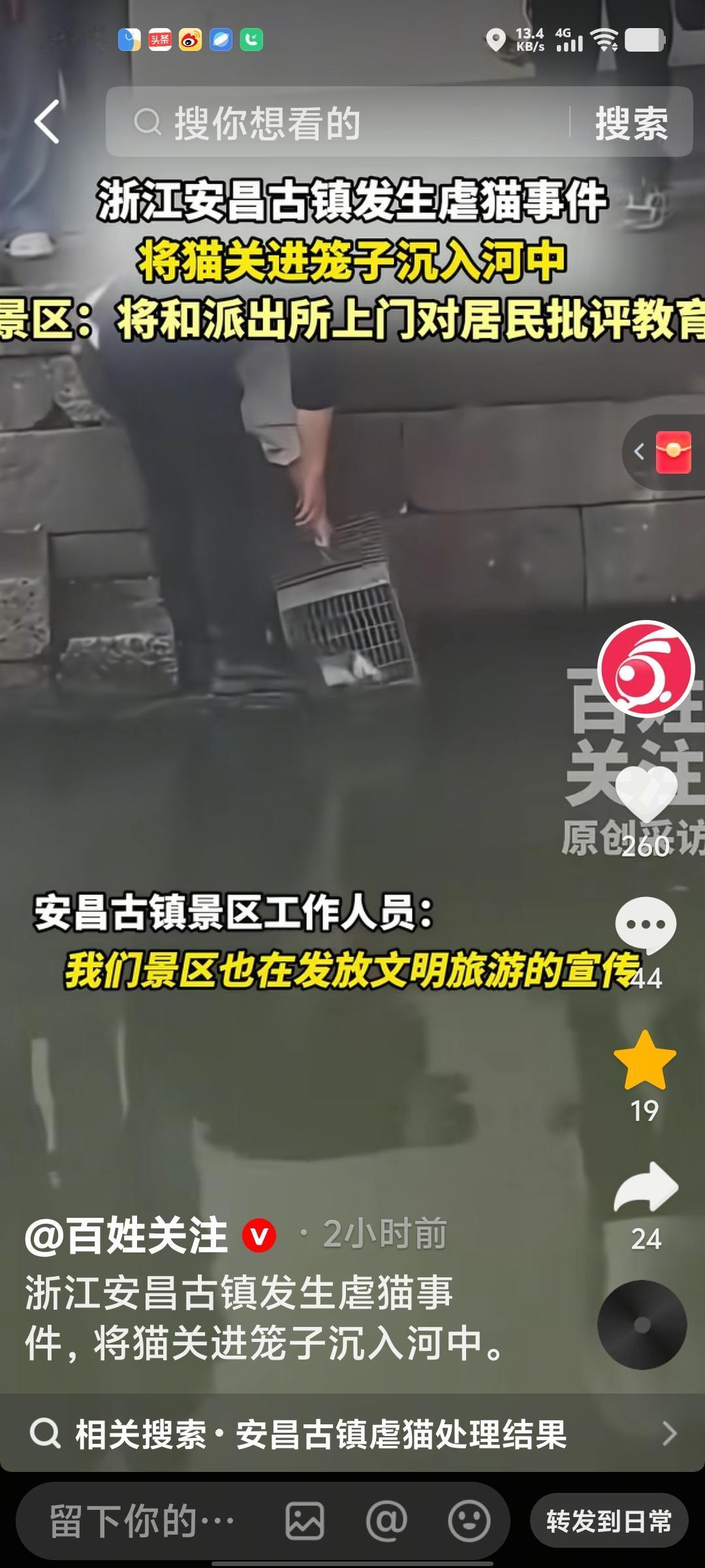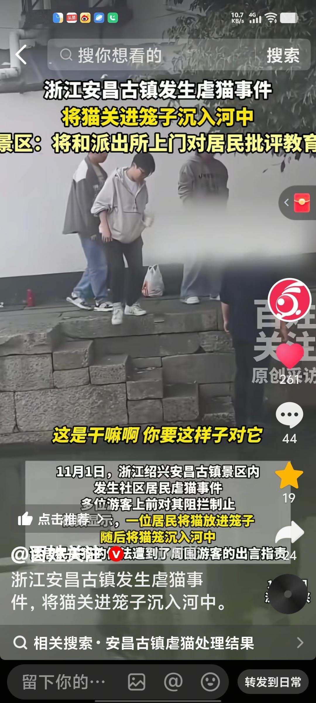揪心!安昌古镇猫被沉河,近百猫遭“伪善放生”溺亡,虐猫为何屡禁不止? 浙江安昌古镇发生虐猫事件。把猫关在笼子里,沉入河中,景区回应将和派出所一起上门进行教育。 事情发生在11月1日,居住在古镇里的一个居民,把猫放进铁笼子。然后把笼子放到河里。 被多名游客发现,飞奔上前劝阻指责,一个游客笼子拽出来。小猫躺在笼子里不动了,不知是死是活。 这么可爱的小动物,为什么就有这些狠心的人进行虐待呢?如果不爱请别伤害。 又想起了昨天广州一个饭馆还晒出了一道菜。把猫煮来吃。看到这样的信息真是心里很难受,对啊。 今天还刷到一群人,打着放生的幌子带来许多猫赶到河边,还往河里赶,这哪里是放生,明明就是虐待动物。 我家里也收养了两只流浪猫,平时看见猫咪都觉得很可爱