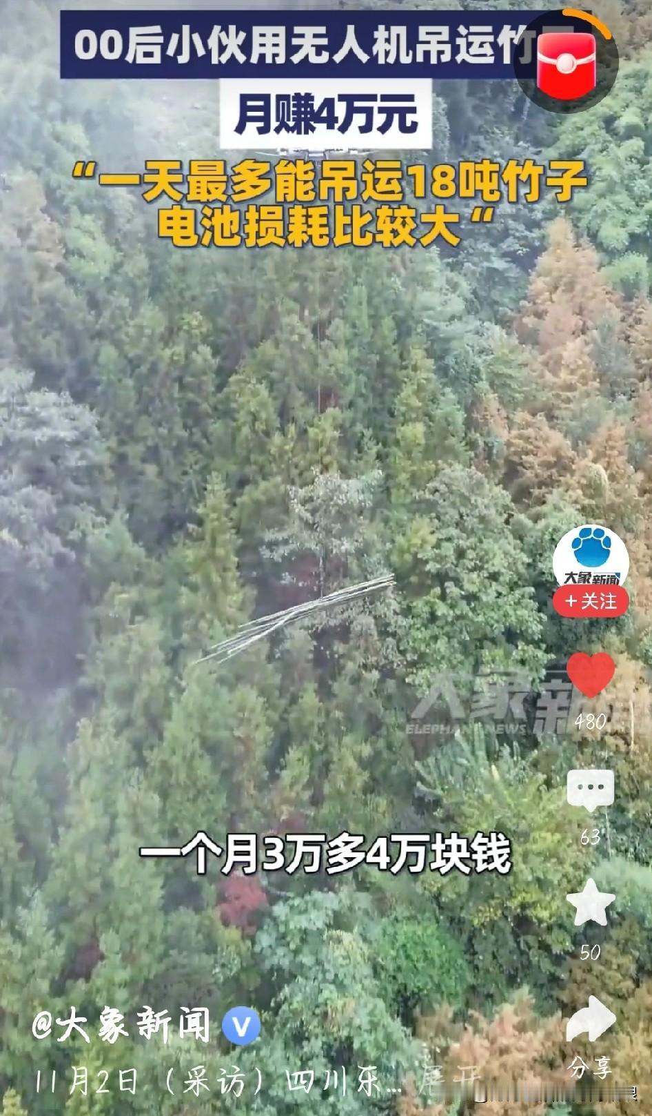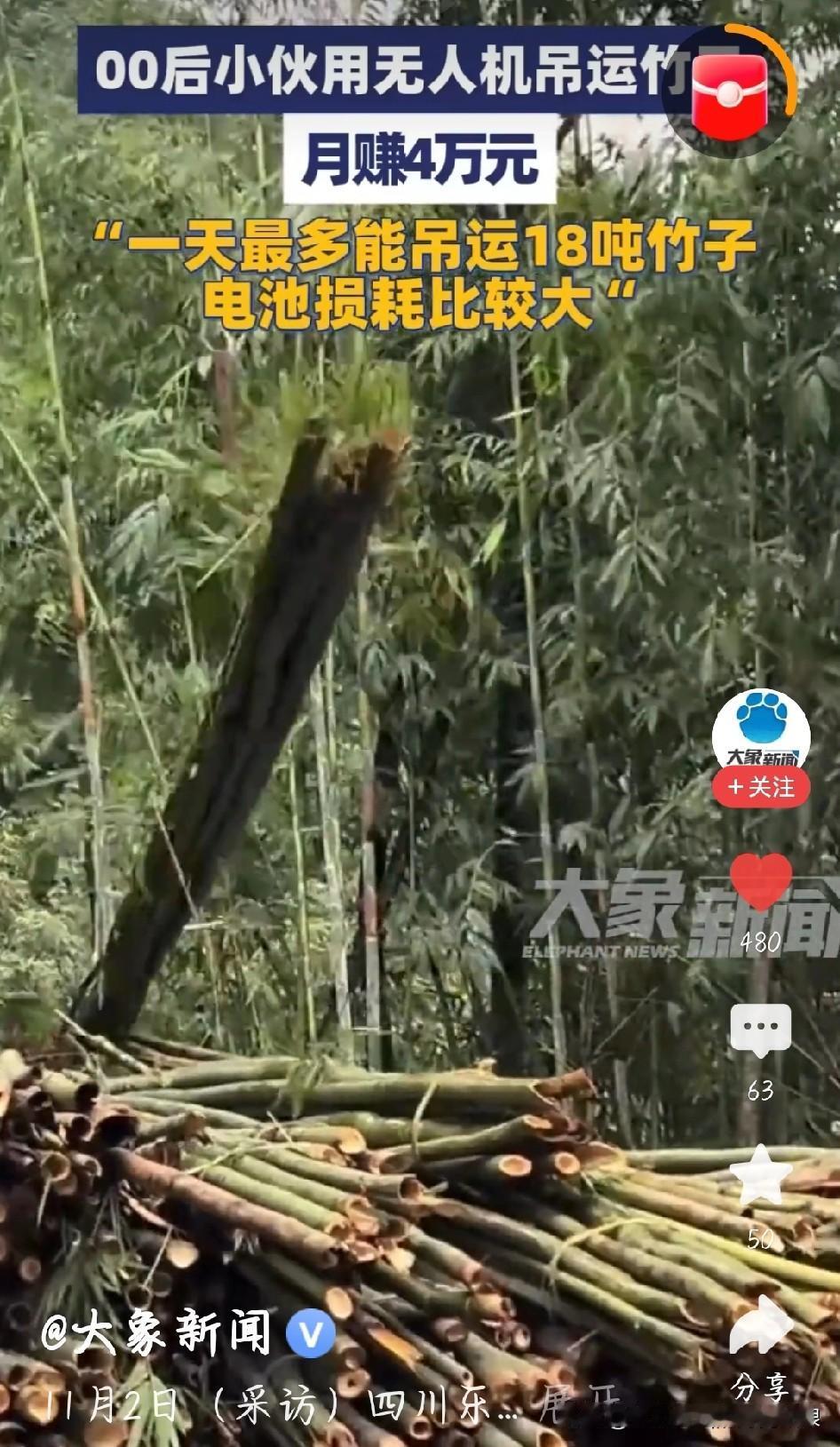 刷到00后小伙用无人机运竹子月赚4万,这操作太牛了!以前山里运竹子全靠人背,山高路陡,半小时才搬一捆,还容易摔伤人。 现在无人机一飞,两分钟就把百斤竹子从悬崖上吊下来,一天能运十几吨。算笔账,一吨收200块,扣完成本一天净赚上千,月入4万真不是吹的。 这哪是“玩飞机”,分明是靠科技挣辛苦钱。既帮竹农把深山的竹子变现,砍竹工也能专心砍树多挣钱 。不得不说,年轻人把新工具用在老行当里,这钱赚得又聪明又踏实!00后小伙用无人机吊运竹子月赚4万元 00后 无人机 论无人机的作用 图片截图于大象新闻
