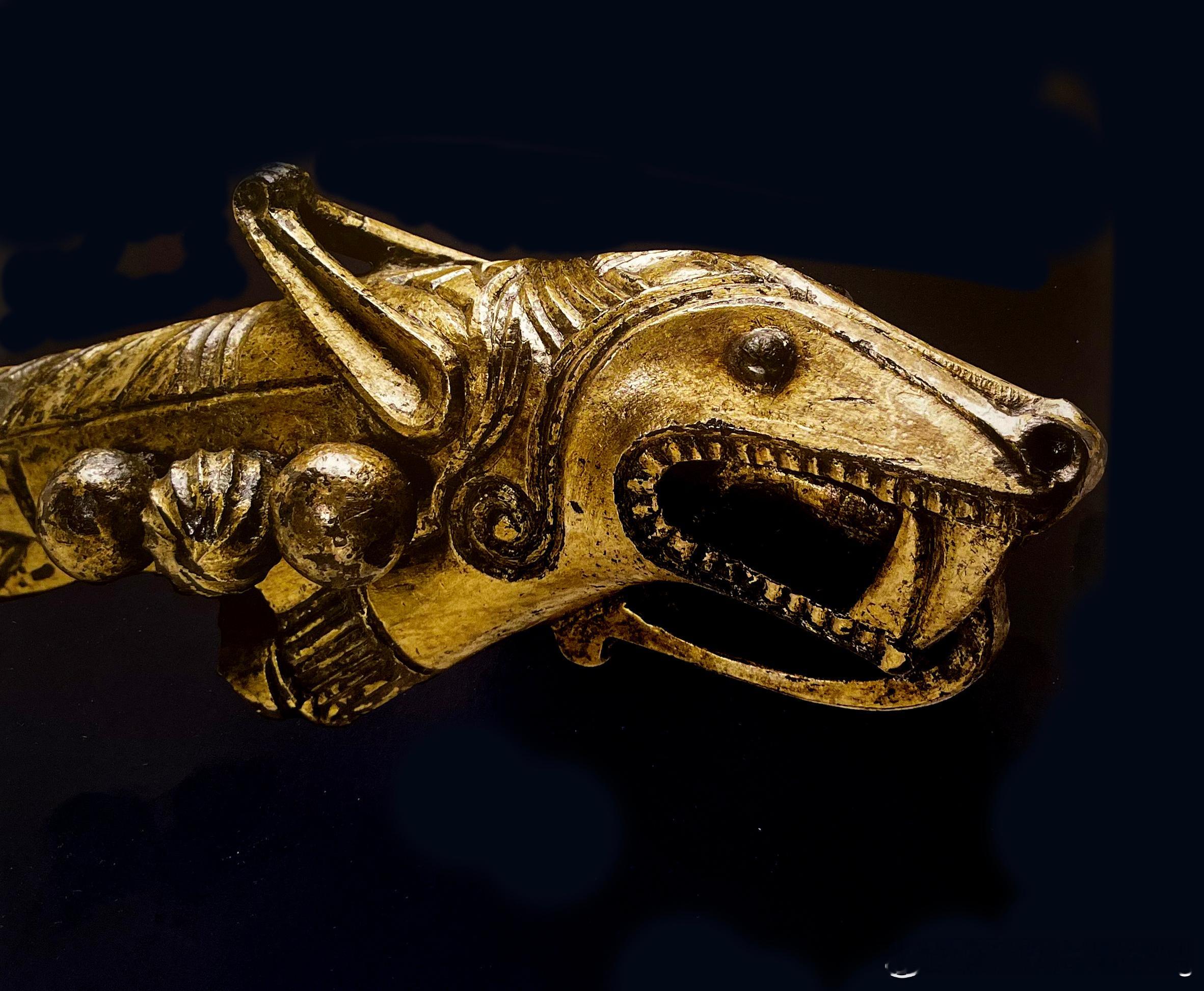 这凶狠的牙齿、卷曲的舌头以及鬃毛都似乎表明这应该是一只狼。它的眼睛由镶嵌的蓝色玻璃圆片构成,当时这些圆片也制作带扣上的动物眼睛。像这样的凶猛生物无疑是一种合适的装饰品。此外,配件的前部有一系列刻印的符文,这些符文与钮钉之间以相同的方式分布,就像基督教祈祷文被放置在圣尼尼安岛马具的末端一样。这些符文似乎没有任何特定的含义,但可能具有护身符的功能,旨在增强武器的力量以保护拥有者。