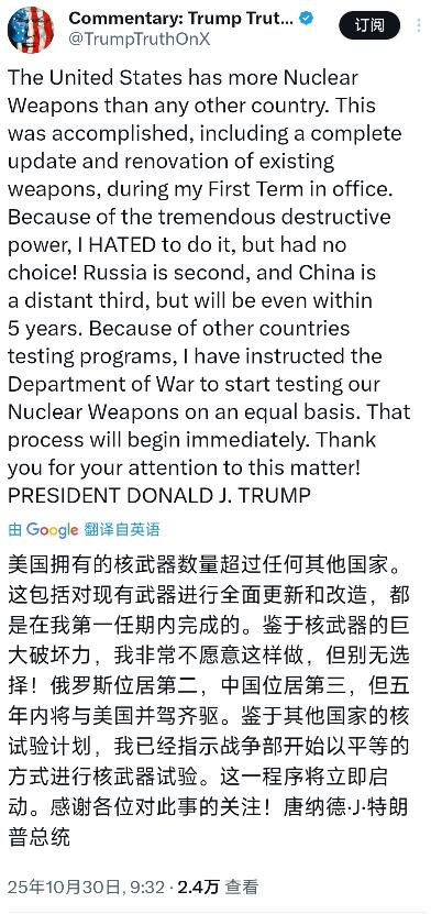 特朗普10月30日发文写道:“美国拥有的核武器数量超过任何其他国家。这包括对现有
