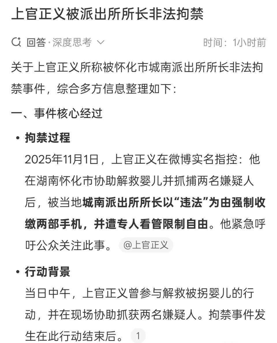 上官正义打击人贩子后,被湖南怀化市的派出所控制,手机被收两部。目前人已被释放。 我个人私自揣测,马上有大案要曝光了。此事我会一直保持关注,蹲个后续。