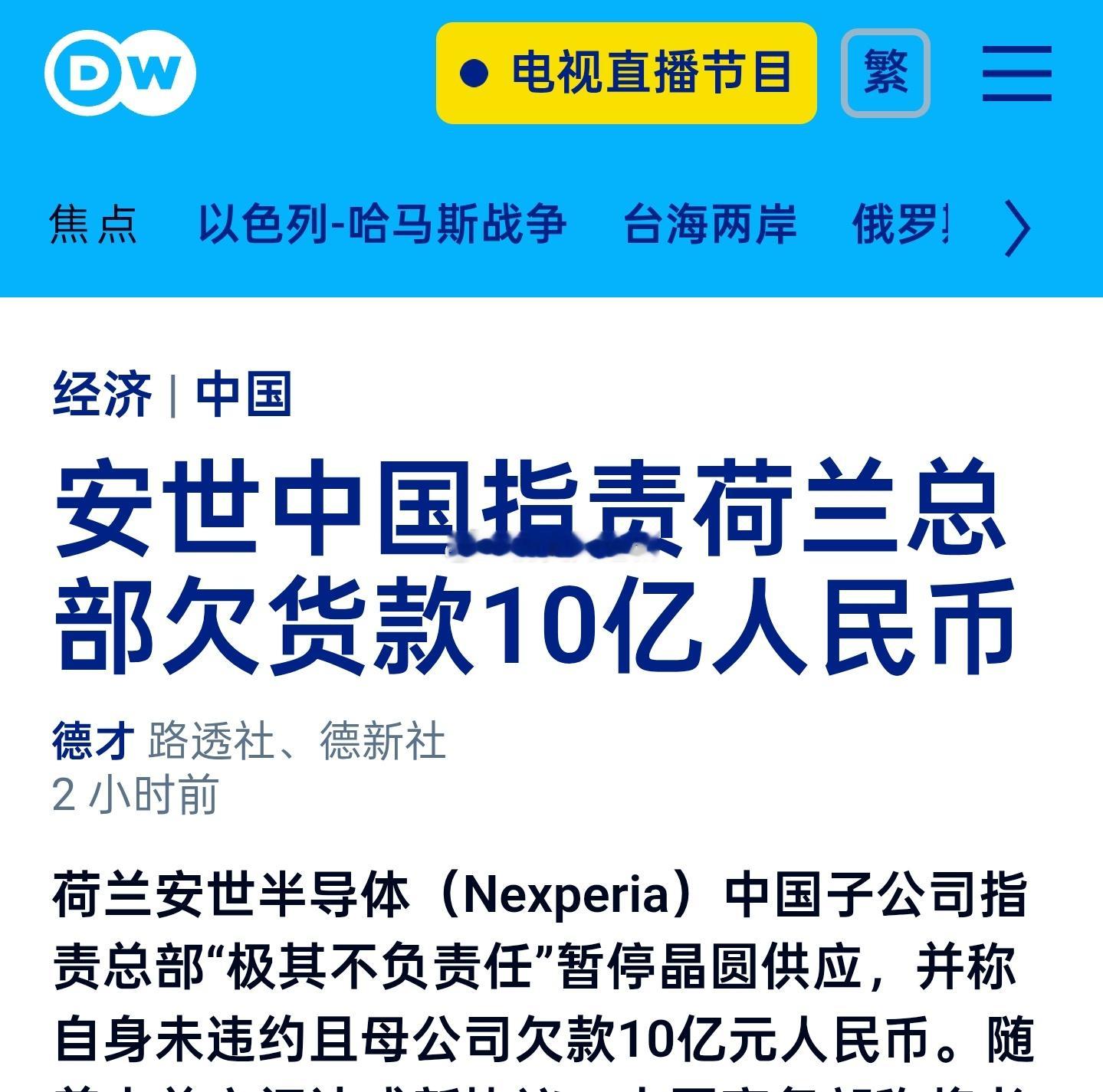 安世半导体中国公司指责荷兰安世“极其不负责任”暂停晶圆供应,并称自身未违约且荷兰安世欠款10亿元人民币。安世中国表示该公司已建立“充足的成品和在制品库存”,其供应链在荷兰安世停止晶圆供应后依然安全稳定,足以满足年底及以后的订单需求。该公司也已开始寻找新的晶圆供应商。