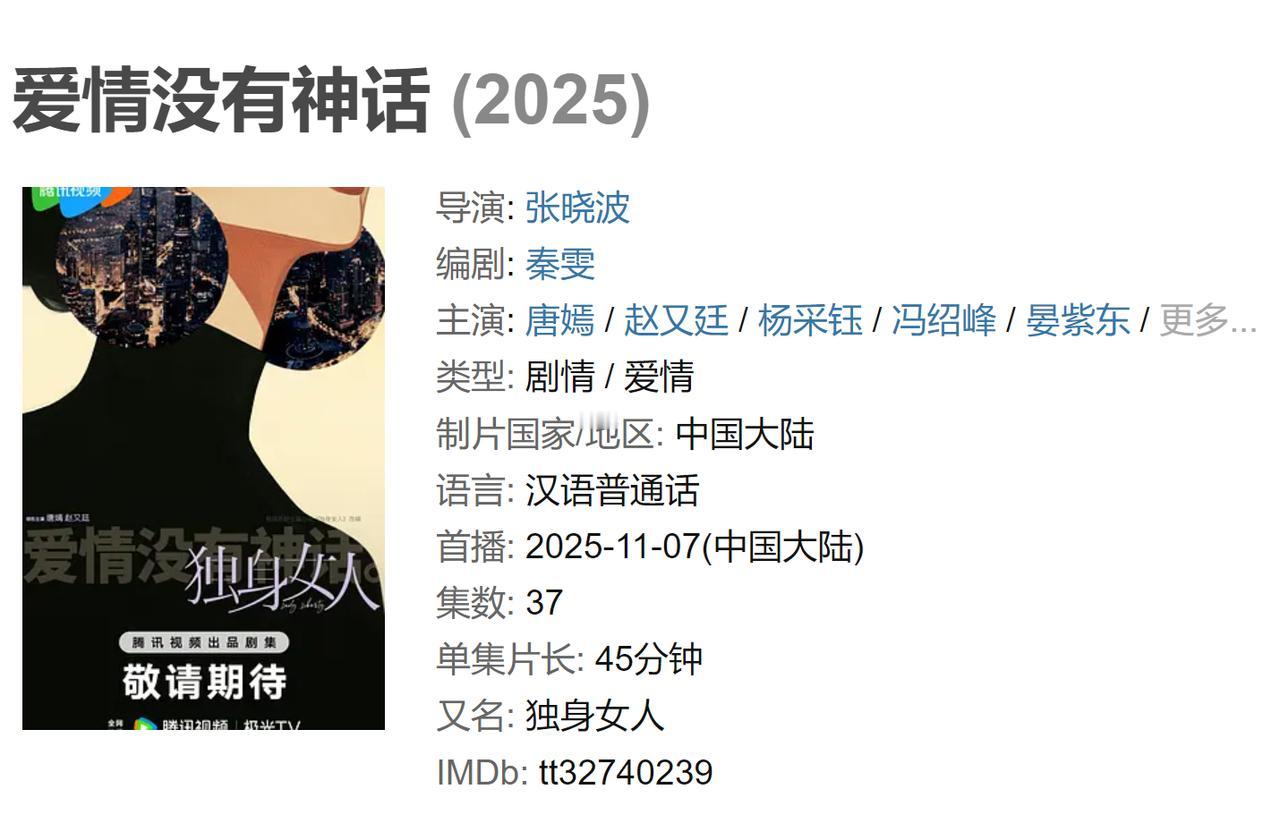 随着秦雯编剧,唐嫣主演的《爱情没有神话》定档央八,我现在十分怀疑“王家卫录音门事件”是一场有预谋的提前预热。 自《沉默的荣耀》在央视八套播完之后,就一直期望于和伟的另一部同类型的谍战剧《惊变》开播。原以为知青剧《依依向北风》结束后,就会迎来《惊变》。 结果没想到,央八安排了一部都市爱情剧《爱情没有神话》,这部剧是由亦舒原著《独身女人》改编的。 更为巧合的是:“王家卫录音门事件”中,就曾经谈到了倪妮和刘诗诗这两位女演员。而话题的引出点,正是她们曾经合作的《流金岁月》,恰好这部剧也是由亦舒作品改编的,编剧正是秦雯。 从收视的角度来看,近些年亦舒作品改编的剧,都挺受观众欢迎的。 去年刘亦菲主演的《玫瑰的故事》亦是亦舒作品改编的,获得了空前的成功,成为了一部现象级作品。 那么《爱情没有神话》,能否复制《繁花》的成功,像《玫瑰的故事》一样,创造出“收视神话”呢? 唐嫣是否能打破“很装”的流言,为自己正名呢?这一切都只有等新剧开播,让观众用口碑来说话了。