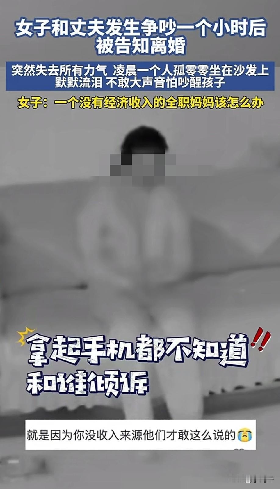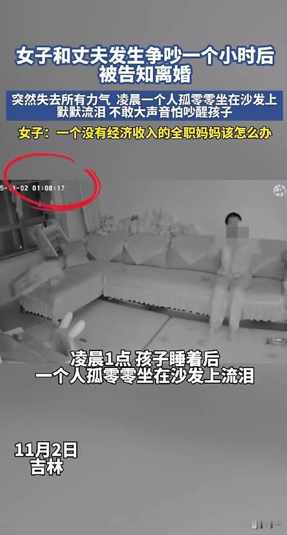 一位吉林女子晒出监控,晚上和丈夫吵了一架,一个小时后,丈夫突然甩出一句离婚。女子突然失去了所有力气,也不知该如何应对。凌晨1点08分,从卧室出来独自瘫坐在沙发上,不敢离家出走,不敢放声大哭,更不敢给公婆说!掏出手机想倾诉,翻遍了微信,却发现无人可诉,最后流泪整理完情绪后,再继续带孩子。 女子穿着睡衣,带着眼镜坐在沙发上,想着丈夫的话久久不能释怀。 和丈夫吵了一架,换来了他一句离婚,可自己一点对抗的底气都没有。全职妈妈的她最大的期待就是老公,却不想被他伤的最深。 女子说不敢离家出走,因为娘家没有任何支撑。不敢放声大哭,怕吵醒孩子,怕吓着孩子,更不敢给公婆说,因为公婆从不向着自己。 最后自己拿着手机,翻遍了微信和通讯录也没打出一个电话,瘫坐在沙发上,默默流眼泪,默默整理情绪,最后还要继续带孩子。 有人说,如果全职妈妈做的好,哪会有丈夫嫌弃,丈夫提出离婚,肯定是受够了妻子的冷漠,不知道心疼男人,所以男人才会提出离婚。 可是一个为你拼了命生孩子的女人,娘家回不去,婆家指望不上,她在这个家能指望谁? 没有收入,花一分钱都要手心向上,给一分都像是施舍,全职妈妈的心酸刺痛了多少女人心!