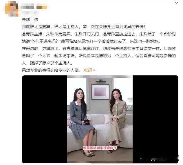 《心动的信号》女嘉宾翁青雅跨界主持采访朱珠,结果成了“社交灾难现场”。她迟到不说,采访时自己先坐,提问卡顿、忘词,频繁依赖提词器,还得朱珠救场,语言表达也差,把采访变成了探访。这视频一曝光就上了热搜,网友狂批她业务能力差。 之后翁青雅道歉,说第一次见朱珠太激动紧张。但有人觉得她用词匮乏,诚意欠缺。她25岁,毕业于伦敦艺术大学传媒学院,可表现却和学历严重不符,让人怀疑是“水硕”。不过也有人觉得该给新人机会,经验需要积累。 这事儿不光是她个人能力的问题,也反映了行业资源分配的状况。 朱珠