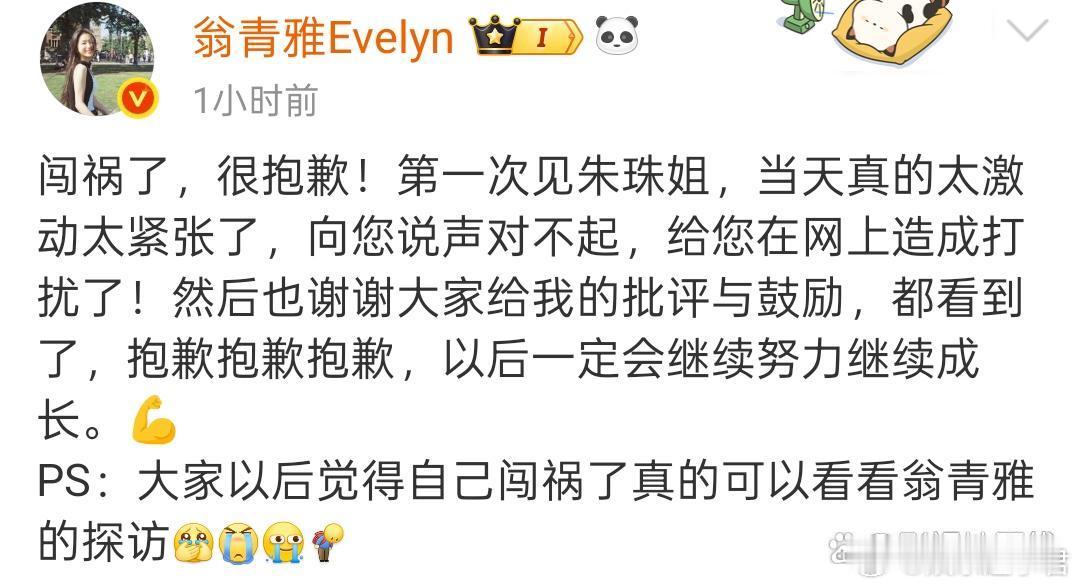 翁青雅道歉11月2日,翁青雅就采访朱珠时让朱珠关门、频繁卡顿忘词等道歉,“第一次见朱珠姐,当天真的太激动太紧张了,向您说声对不起,给您在网上造成打扰了!然后也谢谢大家给我的批评与鼓励,都看到了,抱歉抱歉抱歉,以后一定会继续努力继续成长。