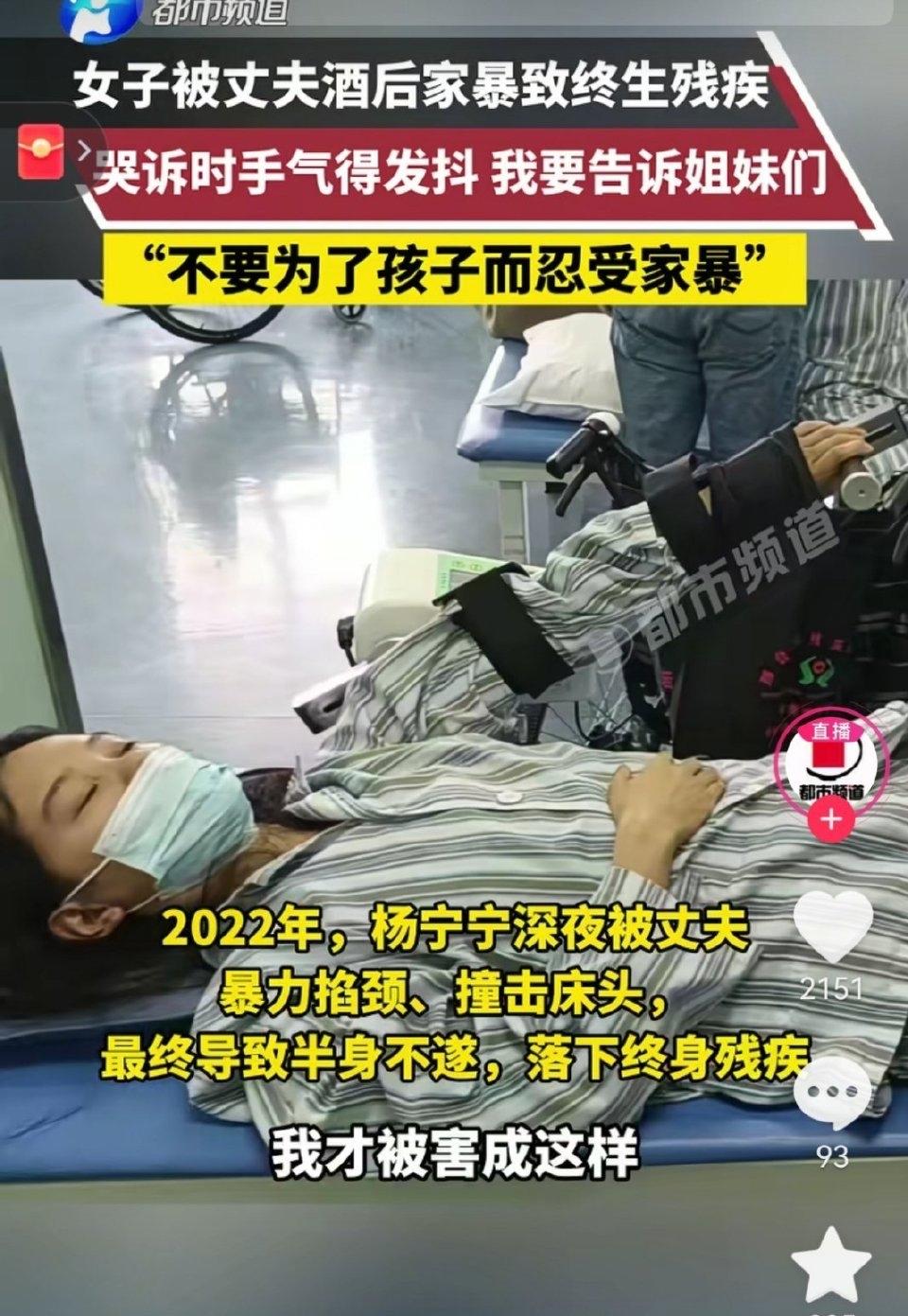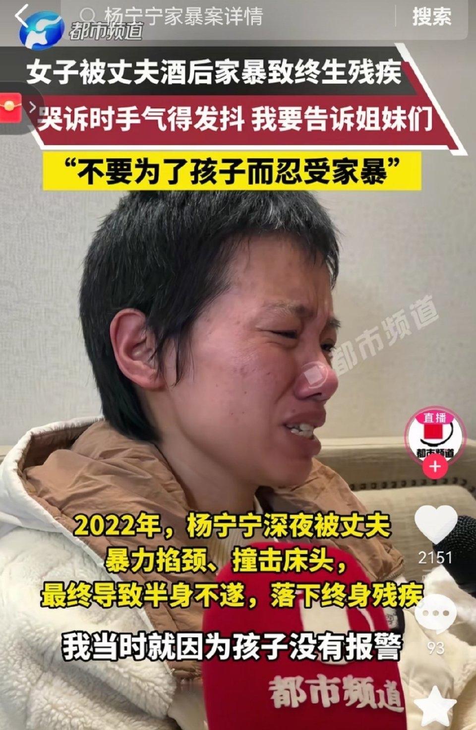 河北沙河市的杨宁宁熟睡中被醉酒的丈夫周某涛掐脖撞击,最终落下半身不遂的终身残疾,只能在轮椅上度过余生。 这段维持了十几年的婚姻,从怀孕时的第一个耳光开始,就埋下了暴力的种子,烟头烫伤、言语控制、频繁殴打,一次次的道歉与原谅,换来的却是致命的伤害。经鉴定,杨宁宁的损伤程度为重伤二级,肢体瘫伤残等级五级,颈内动脉支架置入术后伤残等级八级,而这一切的始作俑者,正是她的丈夫。如今案件即将开庭,可她破碎的人生再也回不到从前。 杨宁宁的遭遇不是个例,多少女性在婚姻里忍受着拳打脚踢、言语羞辱,以为忍一忍就能过去,以为对方会改变,可现实往往是变本加厉的伤害。怀孕时的耳光、带娃时的烟头烫伤,这些细节想想都让人心寒,一个连孕期妻子都能下手的人,心里根本没有爱与责任。 很多人不解,为什么受害者不早点离开?经济依赖、对孩子的牵挂、施暴者的威胁恐吓,还有一次次原谅后的侥幸心理,都让她们难以迈出逃离的脚步。 甚至杨女士的儿子目睹母亲受虐致残后,陷入深度自责与无力感,确诊抑郁症并产生自杀念头,无法接受母亲残疾的现实。杨女士悔恨表示:“容忍家暴本为保护孩子,反致其心理崩溃”。 杨女士一直说是为了孩子忍,满脑子想着孩子,其实这句话真的也给孩子带来了很大压力。孩子真的会认为自己是妈妈残疾的导火索,会精神崩溃很正常! 勇敢对家暴说不,一味的妥协只会让施暴者更加变本加厉。多少女性因为“为了孩子”而一直忍受,但或许在孩子眼里,这样的生活并不是他们想要的,早点离开或许会更好。 希望每一个人都不要遭遇这样的痛苦,也希望正在经历的人能敢于拿起法律的武器保护自己,早日脱离苦海。 来源:大象新闻