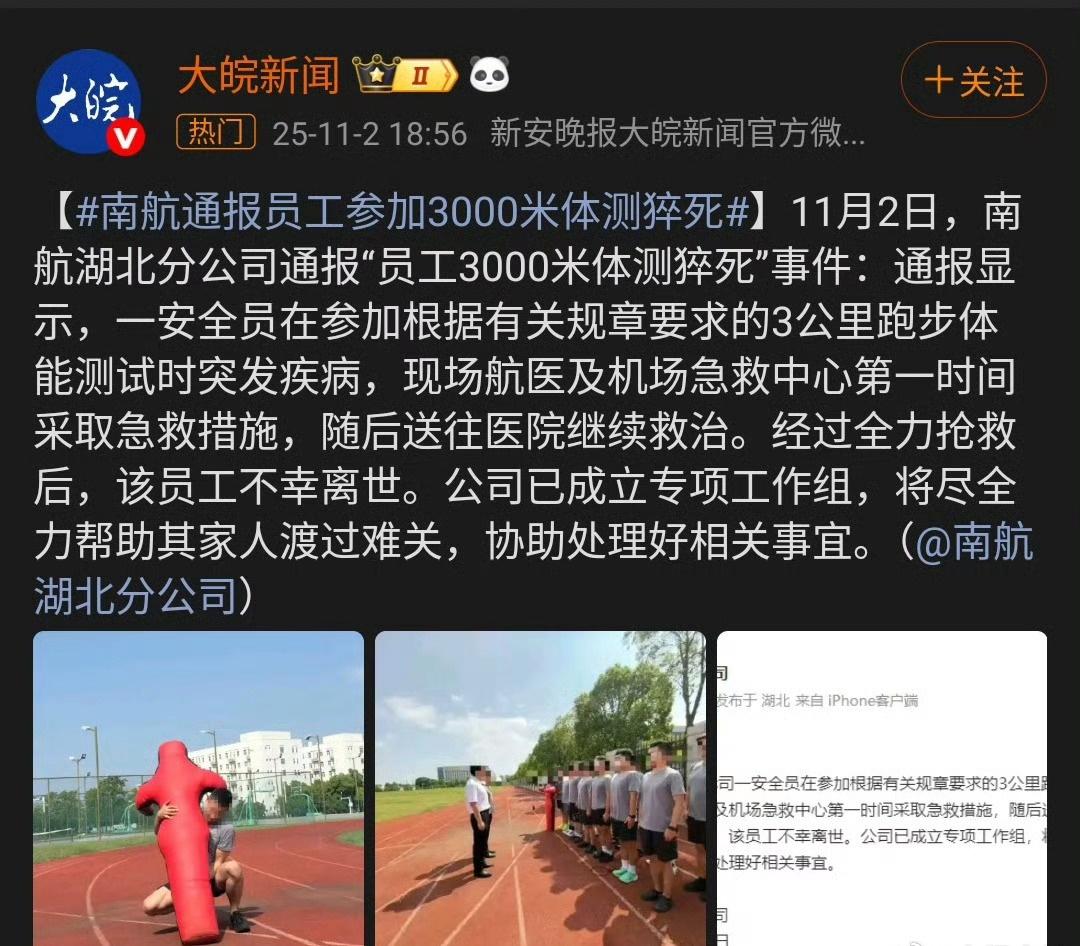 11月2日,南航湖北分公司通报“员工3000米体测猝死”事件:通报显示,一安全员在参加根据有关规章要求的3公里跑步体能测试时突发疾病,现场航医及机场急救中心第一时间采取急救措施,随后送往医院继续救治。经过全力抢救后,该员工不幸离世。 很多人疑惑,咋上班还得做3000米体测啊 大橘估计是特殊岗位要求 从报道看是安全员,这个岗位对体能有要求还是正常的,现场也有航医急救,应该是身体本身有什么隐疾吧,牛马们平时还是要注意身体健康,每年定期做好体检和疾病预防