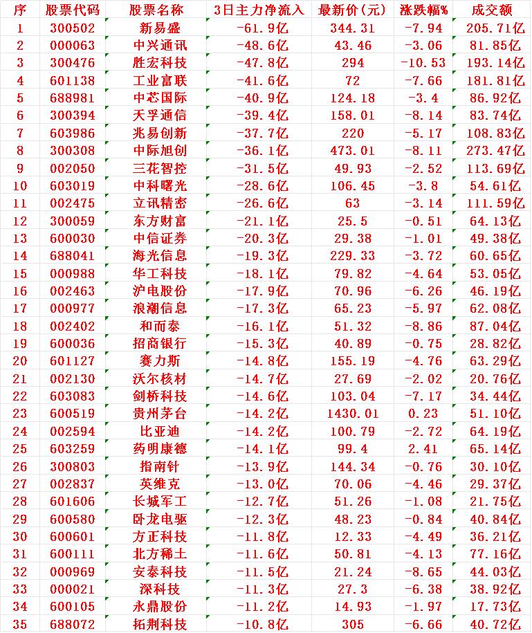 当心!11月3日,前3天主力大幅卖出的35名单 新易盛:3日主力净流出61.