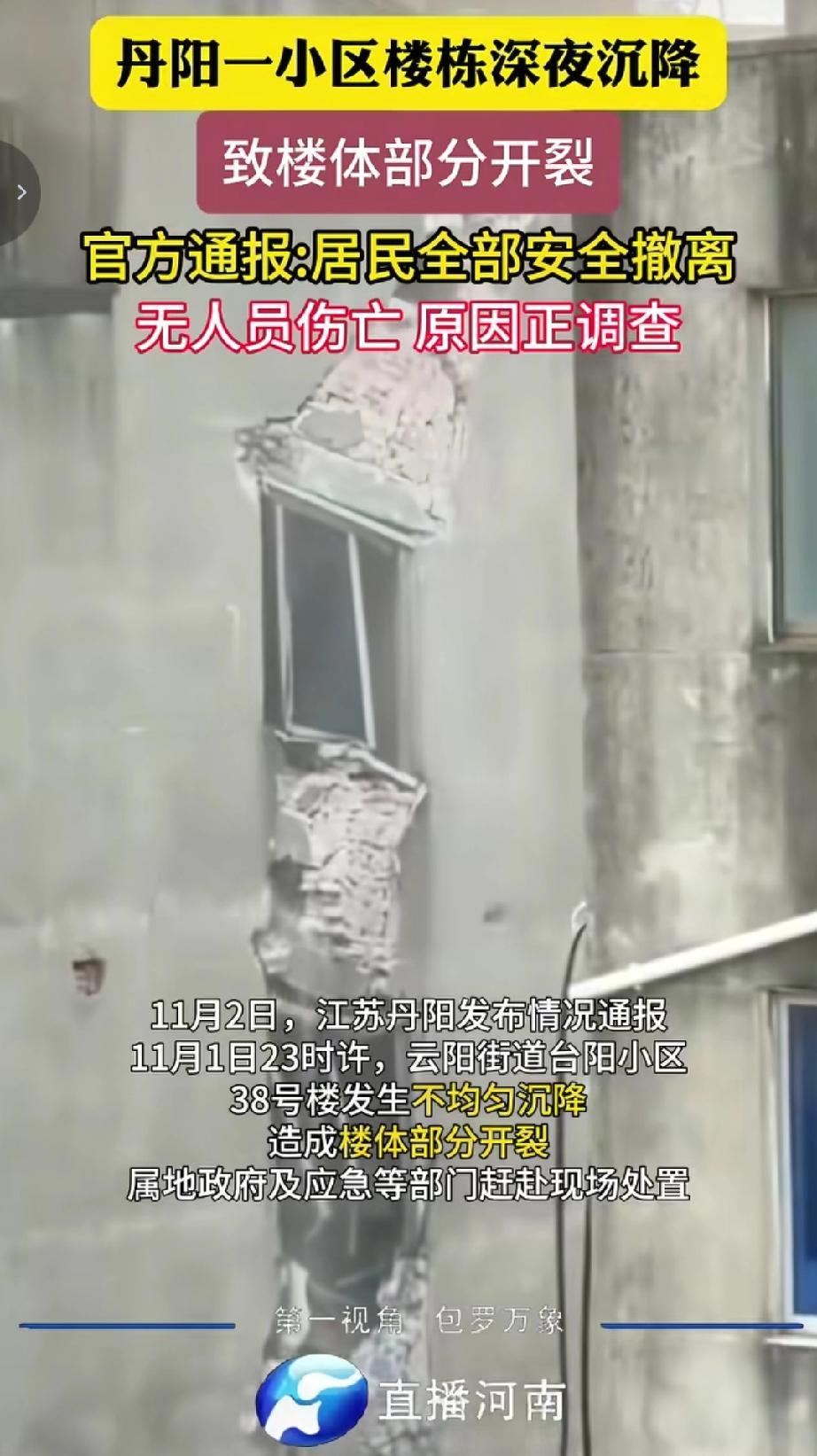 11月1日23时许,江苏丹阳云阳街道合阳小区38号楼发生不均匀沉降。导致楼体部分