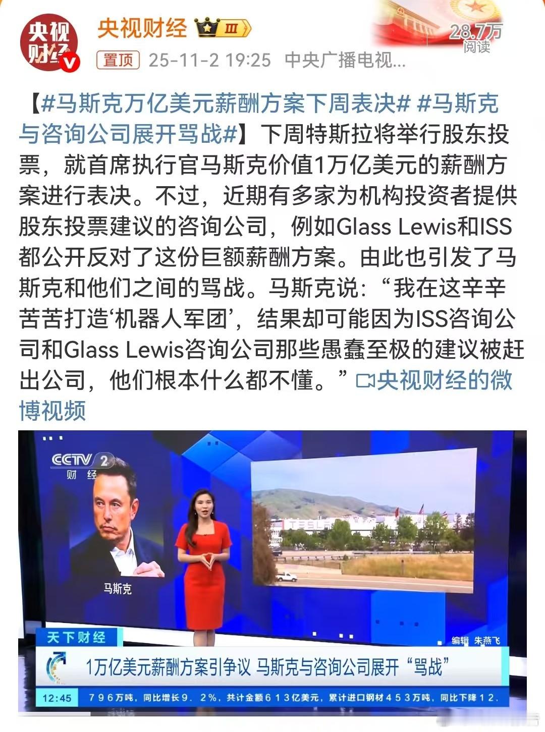 央视财经报道,下周特斯拉将举行股东投票,就首席执行官马斯克价值1万亿美元的薪酬方案进行表决。不过,近期有多家为机构投资者提供股东投票建议的咨询公司,例如Glass Lewis和ISS都公开反对了这份巨额薪酬方案。由此也引发了马斯克和他们之间的骂战。