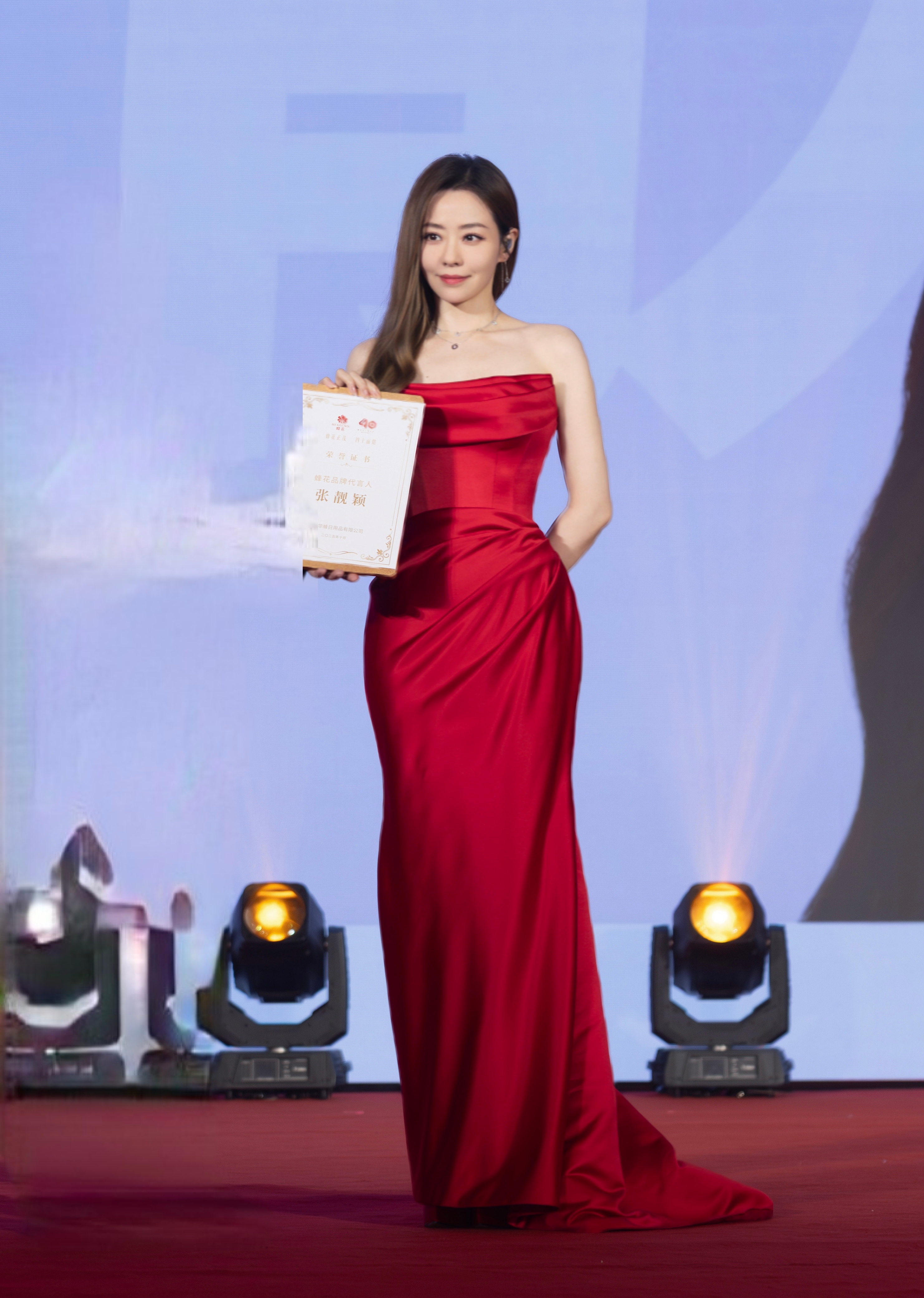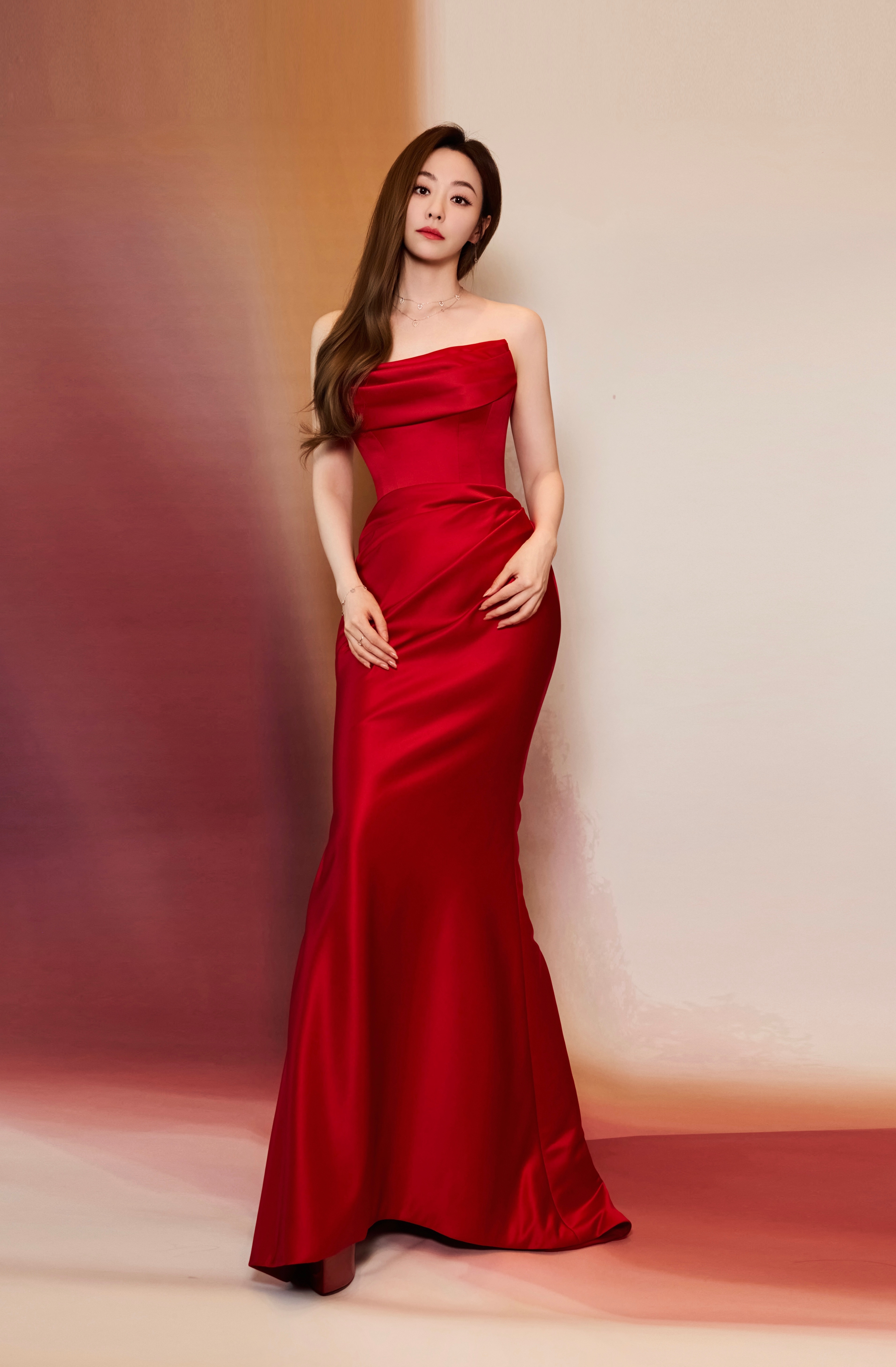 张靓颖 一袭正红缎面鱼尾礼裙,抹胸设计衬得肩颈线条优雅,褶皱细节添了几分灵动,如盛放的红玫瑰,明艳又夺目。