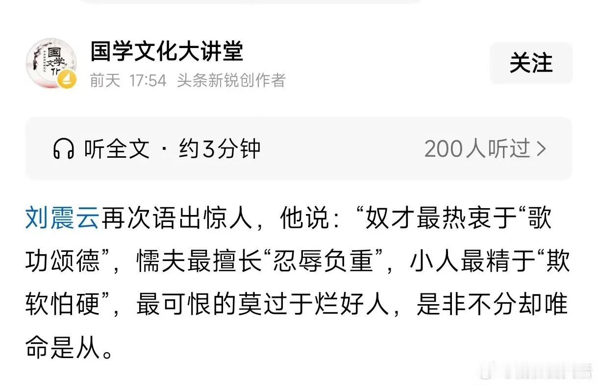 刘震云icon再次语出惊人,他说:“奴才最热衷于“歌功颂德”,懦夫最擅长“忍辱负重”,小人最精于“欺软怕硬”,最可恨的莫过于烂好人,是非不分却唯命是从。 评论: 公知的逻辑思维能力需要培养,公知的民智未开啊!歌功颂德的不一定是奴才!不过这种逻辑分析的问题,公知看不懂的 是不是刘震云说的?