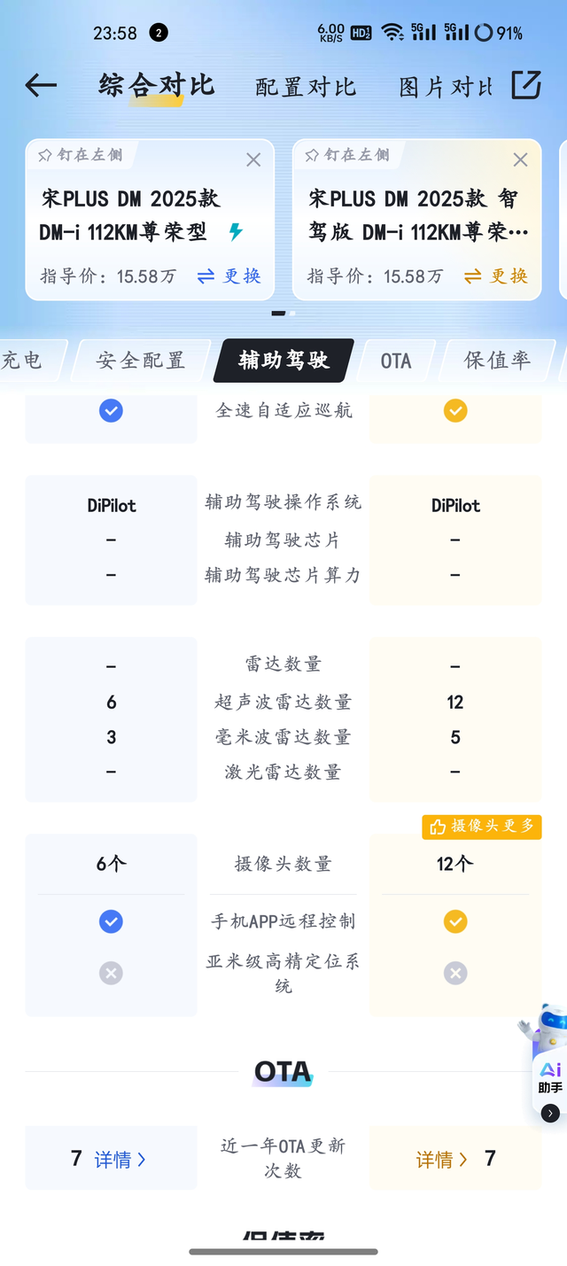 25款和25款智驾区别 作为老车主,我十分不推荐买宋plus,不管是 买新车还是买旧车,除非你想背刺,除非你想当韭菜。 如果非要买的话,我建议买新不买旧。 25款智驾版和25款主要的区别就是多了天神之眼智驾系统和中控屏幕变大了,支持千里眼和哨兵模式了。 现在老款是优惠8000,但是,天神之眼系统就值1万的溢价。 还有,屏幕大了一圈,这个也得值3000. 再加上千里眼和哨兵模式这两个老款没法开通的功能,7000元是值得的。 所以,虽然两款车差值在8000元,但是差的东西可价值20000元。 这么一比,买新不买旧。 但是,我还是建议,不要买,再过6个月,出二代刀片电池,现在的老车主就是明天的你们。