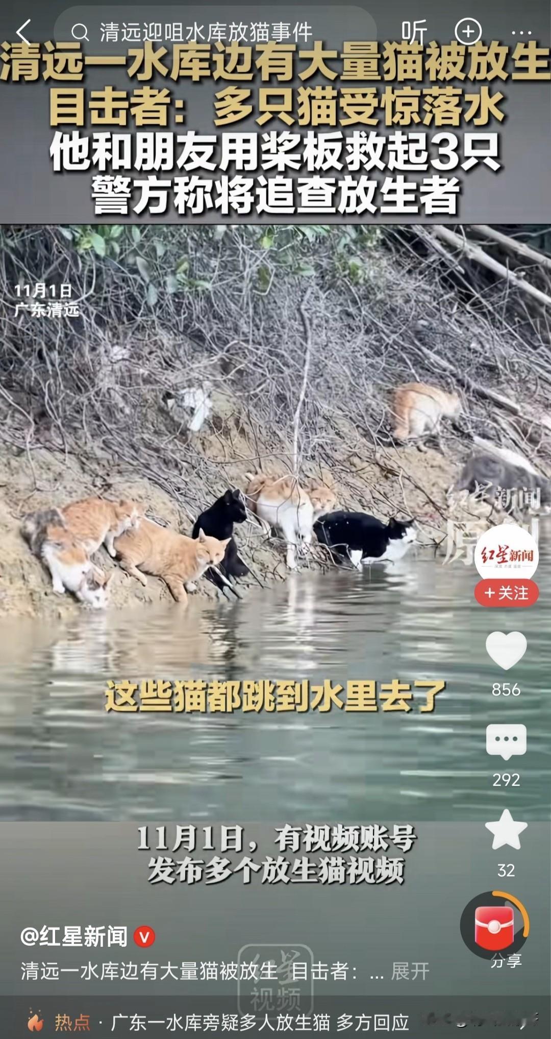 广东清远迎咀水库放生大量猫,有网友怀疑这是有人故意捣乱。11月1日网友发视频,看到一伙人用车拉来好多野猫放生,部分猫躲进山林,还有的被逼跳水库。这哪是放生,简直就是虐杀。 第二天清城区龙塘镇政府就发了通报,水利部门巡查水库暂时没有发现溺亡猫,生态环境部门检测水库水质也是达标的,动物卫生防疫部门也做了消杀。可网友质疑得没错,放生猫破坏生态,这么多猫一旦死在水库还可能污染水源,这种放生根本就是“伪善”。网友建议尽快追查放生者,弄清楚这些猫的来源。