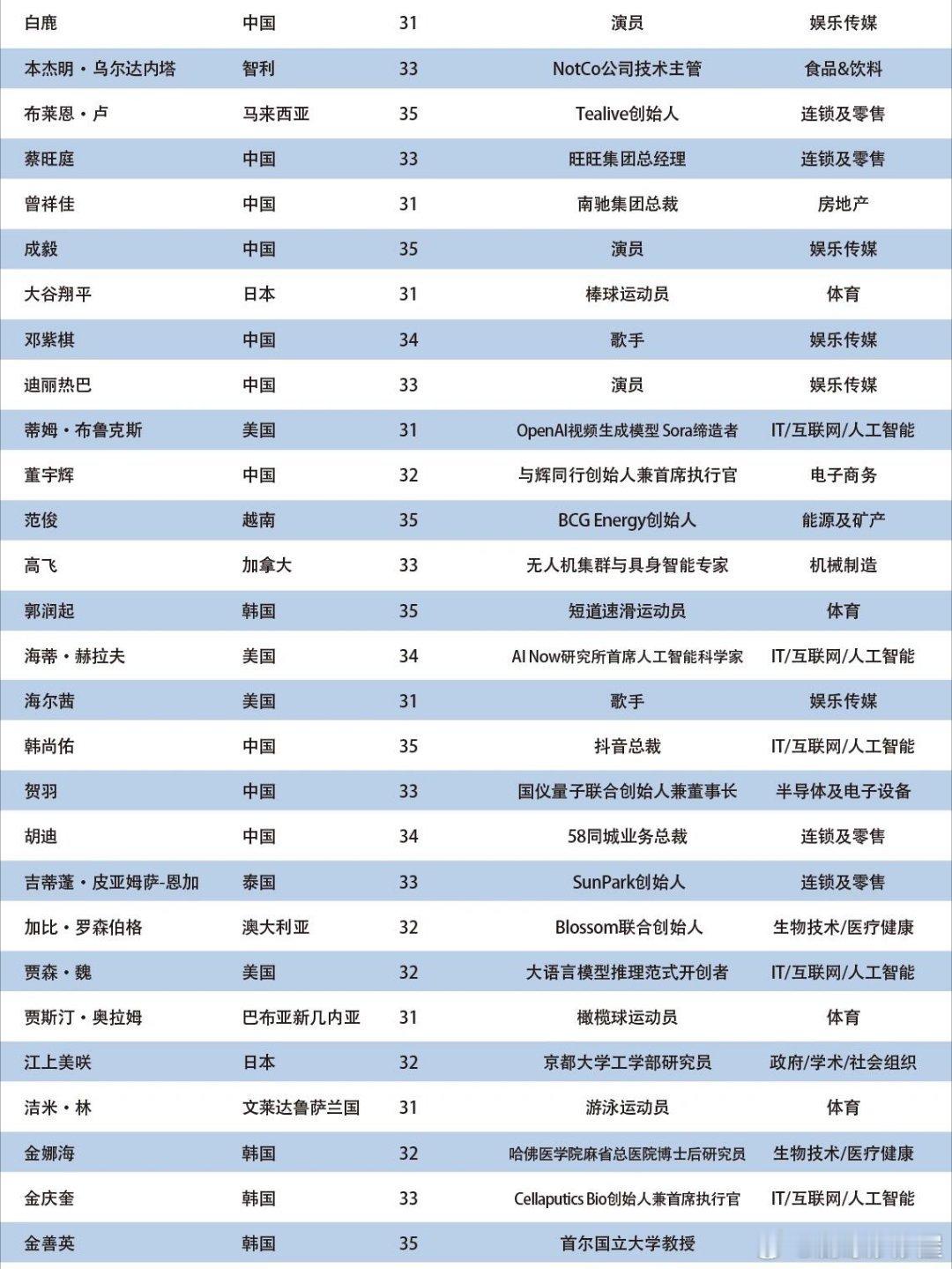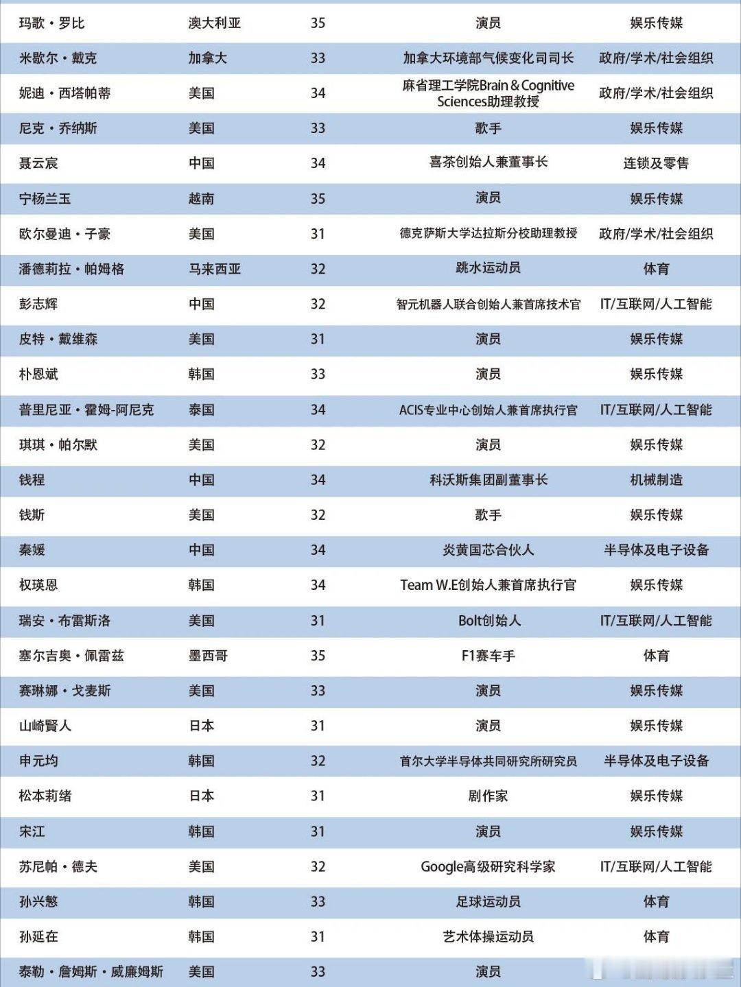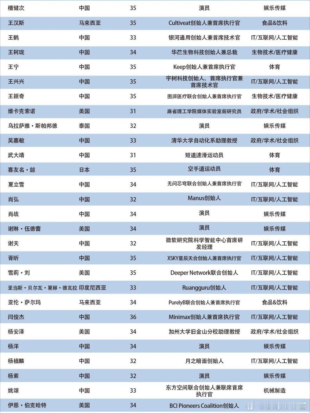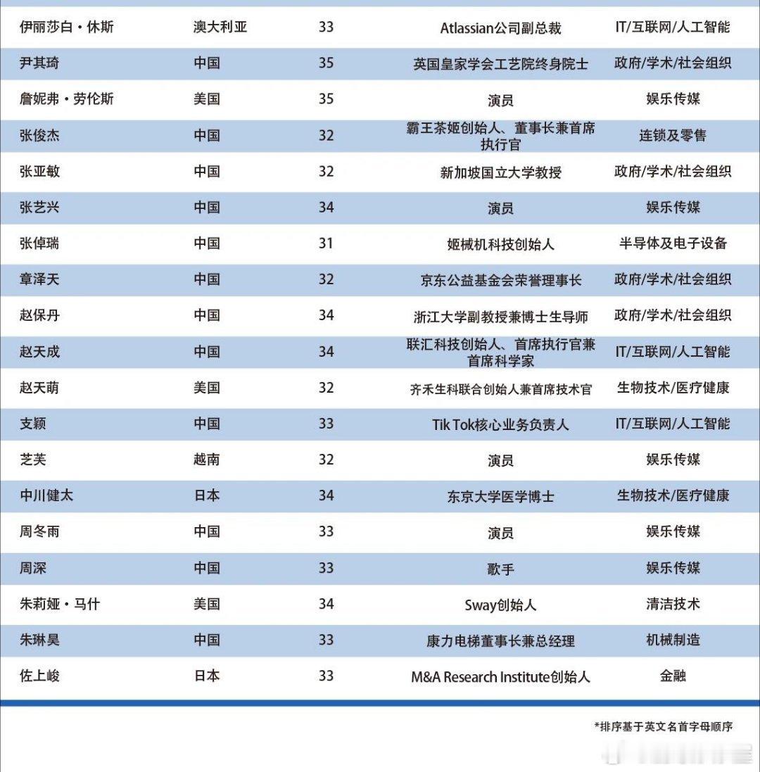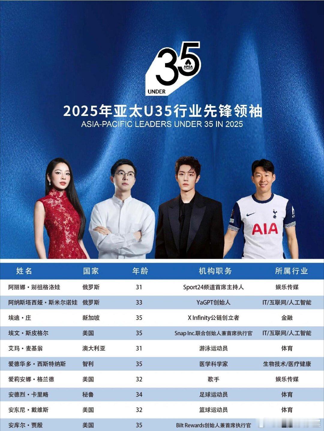2025亚太U35行业先锋领袖——共141人当选,以表彰对亚太地区经济发展和社会进步作出独特贡献的创业翘楚和行业精英。入选的中国演员有: