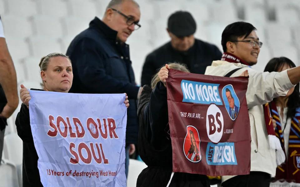 球迷主要反对的是俱乐部主席沙利文和小股东布雷迪,希望他们滚蛋。因为从莫耶斯率领球队夺得欧协杯冠军后,俱乐部高层瞎折腾,球队一路下滑,如今到降级区了。
