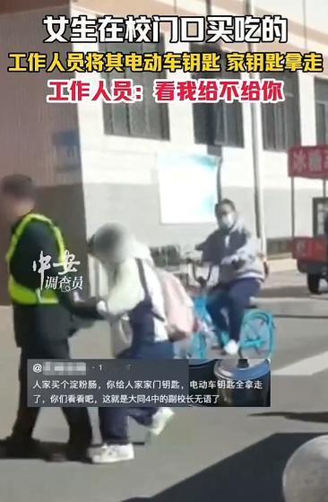 “好大的官威啊!”山西大同,女生在校门口买吃的,工作人员将其电动车钥匙拿走!女生