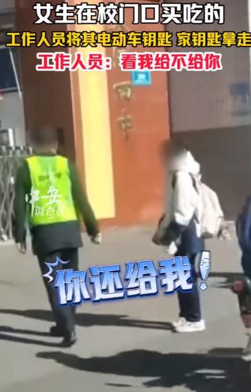 “好大的官威啊!”山西大同,女生在校门口买吃的,工作人员将其电动车钥匙拿走!女生哭着求工作人员还给自己,工作人员却说:“看我给不给你……”网友:学校的工作人员,有抢夺学生财物的权力了吗? 最近刷社交平台,总能刷到有人问“大同四中淀粉肠到底咋回事”。 点进话题翻半天发现,大家吵的根本不是“学生能不能吃路边摊”,而是工作人员拿钥匙时那副“我说了算”的态度,还有女生追着哭着要钥匙的样子——换谁看了都得觉得不对劲。 这事得从11月1号周六说起。 那天大同已经挺冷了,风一吹能让人缩脖子,大同四中校门口没平时那么多学生,显得挺清净。 有个女生背着粉色双肩包,骑着电动车停在路边,估计是饿坏了,没多犹豫就走向小吃摊,花三块钱买了根刚煎好的淀粉肠,油纸袋还冒着热气。 她站在电动车旁,刚撕开油纸袋一角,还没把肠递到嘴边,一个穿绿色马甲的人就快步走来。 这人是学校工作人员,胳膊上别着“管理”红袖章,走到女生跟前既没问“知道学校不让买吗”,也没说“这东西可能不卫生”。 直接伸手从女生口袋里掏出电动车钥匙,连带着串在上面的家门钥匙一起拿走,攥在手里转身就往学校大门走,步子又快又沉。 女生当时就愣了,手里还捏着热乎的淀粉肠,反应过来后赶紧小跑着追上去,声音带慌:“叔叔,把钥匙还我啊,我还要回家呢!” 可工作人员跟没听见似的,头都没回,走了几步还停下回头瞥了女生一眼,语气挺冲地甩了句:“看我给不给你!” 说完接着往校园里走。 女生急得眼泪一下子涌上来,眼眶红红地伸手想抢钥匙,结果被对方猛地一甩手。 女生没站稳,往后退两步差点摔在路边,手里的淀粉肠也掉了,油纸袋破了个口。 更让人不舒服的是,校门口岗亭旁还站着个戴红标帽子的保安,手里拿着对讲机,全程看着这事。 既没拉工作人员,也没劝女生,就双手插兜站着,跟看热闹似的,一句话没说。 女生看着掉在地上的淀粉肠,又看着越走越远的工作人员,只能抹着眼泪跟上去,一路哭着追进学校大门。 路过的几个学生停下来看了两眼,也不知道发生了啥。 后来有知情人说,女生追进学校后,被工作人员带到传达室旁边,站在冷风里被批评了快二十分钟。 翻来覆去就是“学校三令五申不让买,你偏不听”“吃坏肚子怎么办”“一点规矩都没有”。 女生低着头,眼泪一直掉,没敢反驳,直到工作人员说够了,才把钥匙扔给她,让她“下次再敢买就叫家长”。 女生捡起钥匙,捂着脸跑出了学校。 这事被路过的家长拍了短视频,发到本地论坛后没两天就转到各大平台,评论区一下子炸了,跟帖的人越来越多。 有不少网友替女生抱不平:“孩子饿了买口东西垫肚子,没犯啥大错,至于扣钥匙吗?” “电动车和家门钥匙是私人物品,他一个工作人员凭啥拿?这不是欺负孩子吗?” 还有人质疑管理方式:“真担心食品安全,该去跟摆摊的沟通,或联系城管处理,光盯着学生罚算啥本事?这是捡软柿子捏!” 也有少数网友理解学校:“学校也是为了学生好,路边摊卫生没保障。” 但话锋一转又说:“可方式太硬了,对女生这么凶还扣钥匙,一点人情味都没有。” 面对这些议论,大同四中先是在官微发声明,说成立了工作小组调查,承诺“依法依规处理涉事人员,给大家交代”,态度看着挺认真。 可没过三天,有媒体采访到学校一位领导,对方说“网上视频有夸大成分,很多细节没拍全”。 还强调“这是正常校园管理,担心流动摊贩食品不安全,学生吃坏肚子家长又该找学校了”。 这话不仅没平息争议,反而让更多人不满。 现在大家还在等大同四中的调查结果,想知道涉事工作人员会怎么处理。 更想看看学校会不会反思这种“简单粗暴”的管理方式。 毕竟,一根淀粉肠引发的争议看似小事,实则关乎“校园管理该有怎样的温度”——是用道理说服人,还是用权力压服人。 是尊重学生合理需求,还是只顾“彰显管理权威”。 也正因为这事戳中了大家对“有温度的教育”的期待,才会引发这么多讨论。 那么你们是怎么看的呢? 如果各位看官老爷们已经选择阅读了此文,麻烦您点一下关注,既方便您进行讨论和分享,又能给带来不一样的参与感,感谢各位看官老爷们的支持!