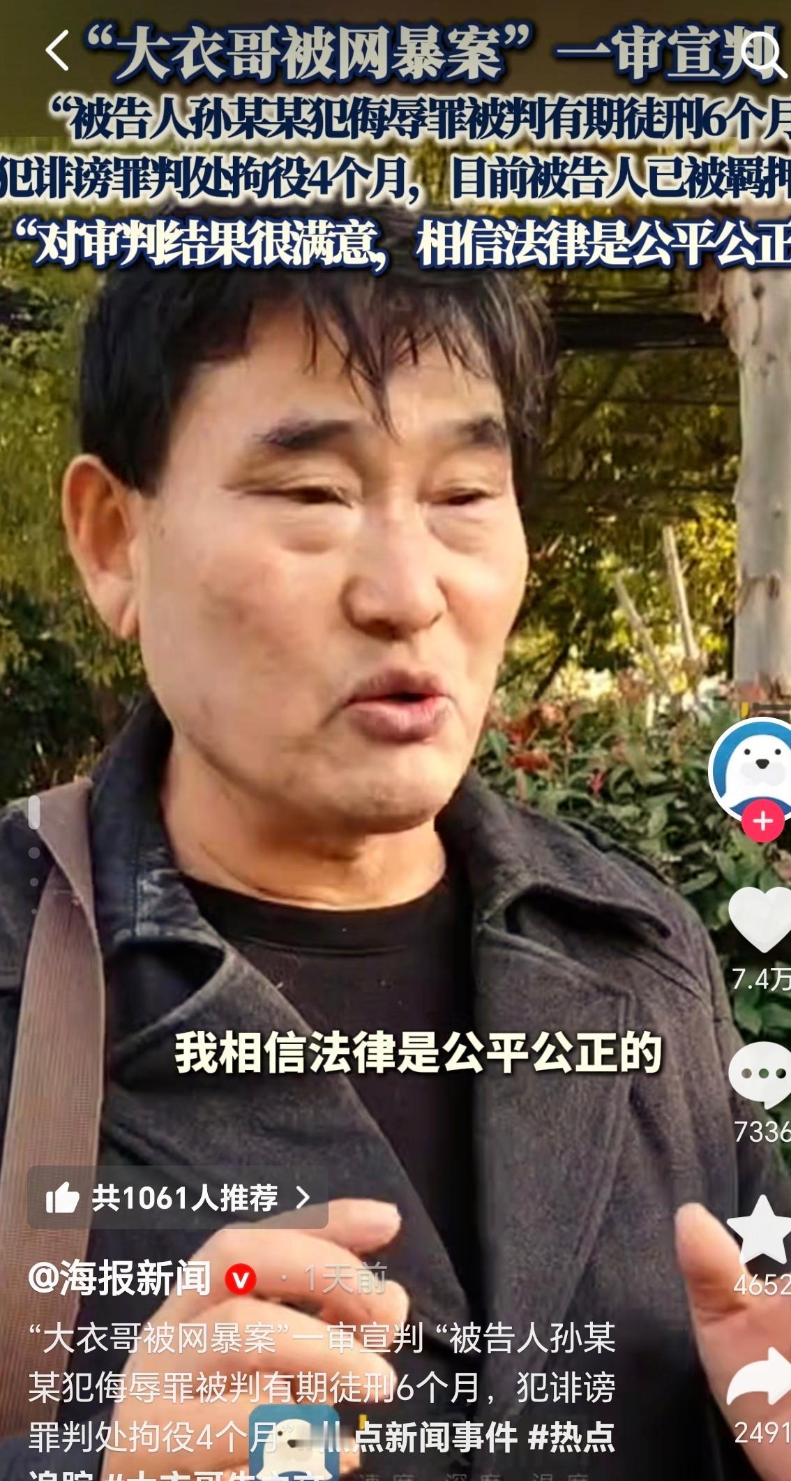 大快人心!女网红当庭哭着求饶,大衣哥却没心软,最终让她进去“踩缝纫机”10个月,这结果太解气了! 谁能想到,这女的跟大衣哥压根不认识,就因为看他流量大,还觉得他是农民好欺负,四年里发了990条言论侮辱诽谤人家全家。以前有多嚣张,现在就有多狼狈,纯粹是被嫉妒冲昏了头,见不得别人过得好。 大衣哥虽说憨厚淳朴,可也不是任人拿捏的软柿子,直接用法律维权,这波操作必须点赞。别以为网络是法外之地,也别觉得老实人就可以随便抹黑,互联网有记忆,恶意诽谤迟早要付出代价。 这事儿就是给所有人敲警钟,说话得有分寸,不能为了逞能或蹭流量就口无遮拦。你们觉得这女网红是罪有应得吗?评论区说说看法~