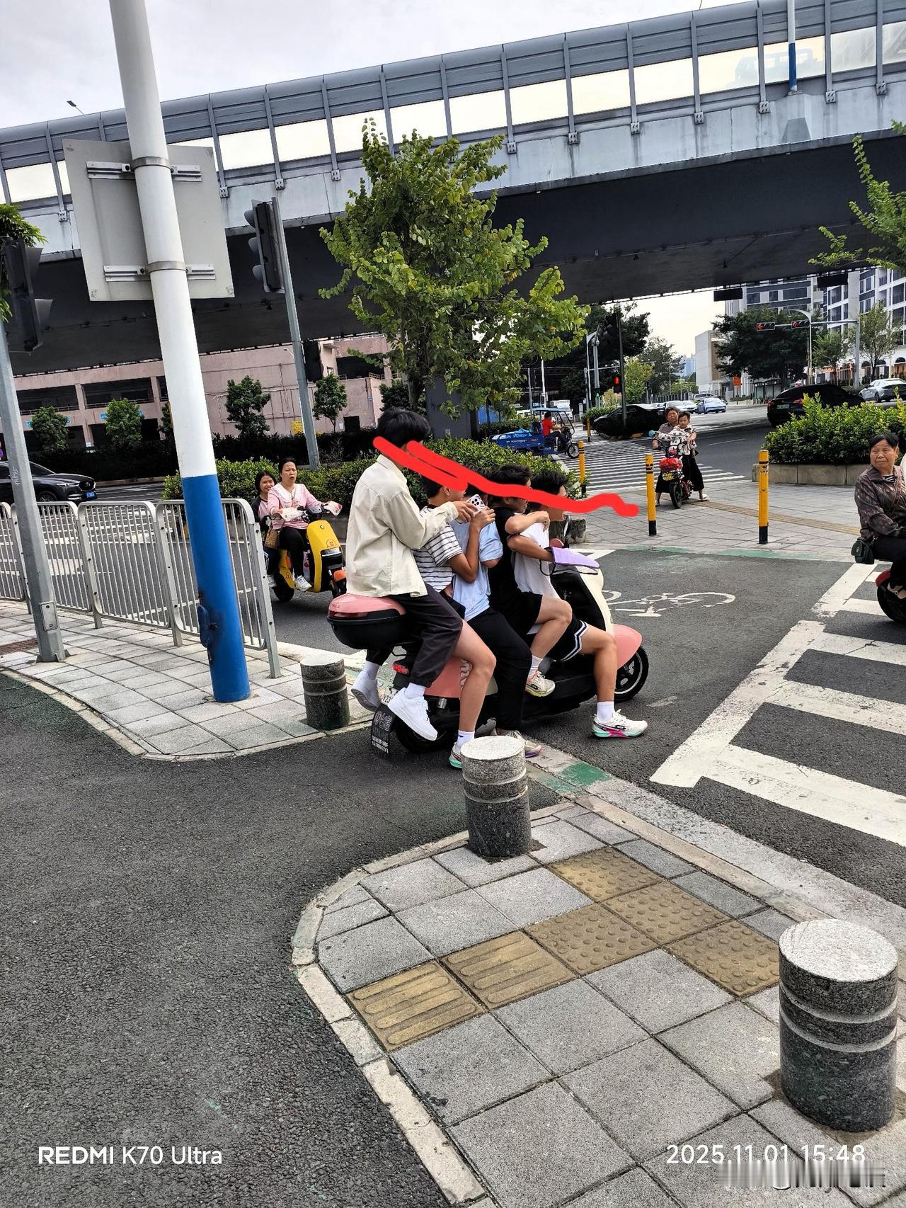 后生可畏,精神小伙,5个人骑一辆电动车,质量杠杠滴! 看车牌,模模糊糊的,像是佛山二字,再看前面人行道上的黄色立柱,应该是佛山的,这是佛山特色。 这也太牛了,佩服骑的那位,这么多人这么重,重心在车尾,还能掌握住方向行驶,小小年纪真是不一般。 旁边经过的阿姨们都惊呆了,瞠目结舌,惊讶的说不出话来。 这几个靓仔,看起来还是初中生的样子。 现在的小伙伴出去玩,除了打游戏,去捞鱼摸虾外,还可能一起去骑电动车兜风呢。 在广州见过4个成年男人搭乘一辆不算大的电动自行车的,4个大男人,也是够了。前面蹲一个,后面坐两个,加上驾驶人,共4个大男人。