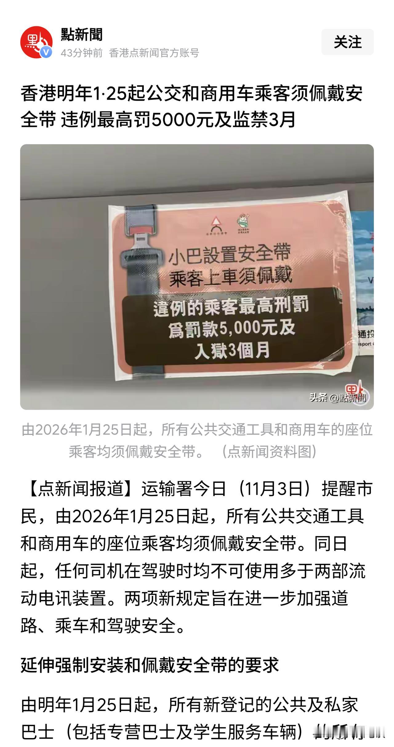 搭乘巴士不系安全带至高罚款5000元并监禁3个月! 没事还是尽量不要去香港澳门玩,避免违反当地规定而遭受损失,即使去也要严格遵守当地规定,否则真是吃不了兜着走都走不了! 香港规定巴士乘客必须系安全带,否则至高可以处5000港元罚款,以及3个月监禁。 澳门在禁烟区吸烟罚款1500澳门元,例如公园,巴士站,餐厅都是禁烟的。餐馆桌子玻璃下面有简体字的告示,专门给内地游客看的。 曾经有内地老人开电动轮椅去澳门,走机动车道,被处罚的。澳门道路狭窄,没有非机动车道,只有机动车道和人行道。 按照当地规定,电动轮椅只能走人行道。 在我们内地,电动轮椅是按照非机动车管理的,需要走非机动车道。 在澳门,行人走禁止通行的路段,是要罚款300澳门元的。