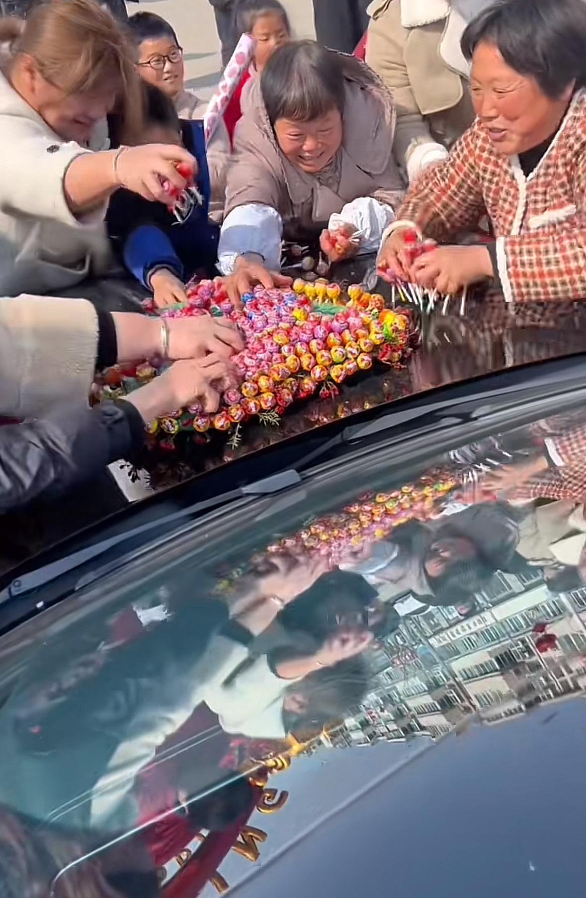 分享喜悦,棒棒糖婚车花,新娘还没下车都被抢了!喜事只要高兴三天不分大小,不分老少。抢也是一种喜气氛围,但是别贪!这么多人吃喜糖,拿根儿就行了!给后边的人也留点,大喜的日子图个吉利图个甜蜜!也不能疯抢吧!别给车刮花了。新娘新郎一定会幸福,这么多人吃喜糖。