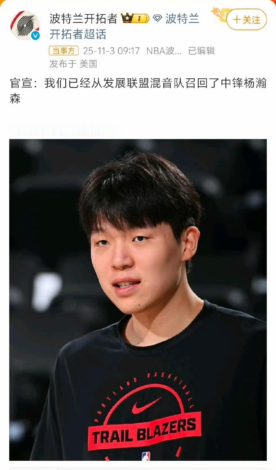 杨瀚森回来了!!! 开拓者官宣:我们已经从发展联盟混音队召回了中锋杨瀚森。 明天对阵湖人估计能上场了。被下放了一天?杨瀚森就回来了,发展联盟一场球都没打。