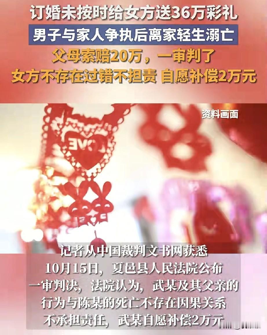 “实在是不应该!”男子与女友订婚,商定好的36万元彩礼,因为当天男子父母没有及时把彩礼送过去,女友催了男子一句,男子回家与父母起了争执,一气之下轻生,女友感觉到事态不对之后给男子打电话安抚,还给他的亲友联系让他们赶快去寻找,但是最终也没能阻止住他跳河溺亡。 事后,男子父亲将亲家父女告上法庭,索赔20万元,法院审理后认为,女方催促彩礼的行为并未构成逼迫,并且积极劝阻男子的轻生行为,与男子的离世没有法律上的因果关系,无需承担责任。而亲家一家考虑到实际情况,自愿补偿的20000块钱。这起悲剧就这样画上了一个圆满的句号!