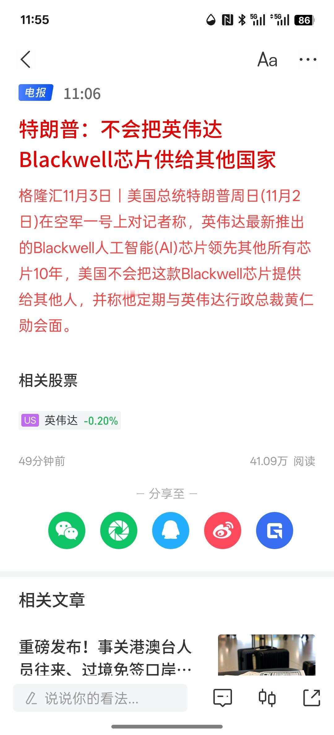 英伟达最新的AI芯片领先其他芯片十年,特朗普:不会把英伟达Blackwell芯片供给其他国家!美国的最先进芯片不会卖给其他国家,那对于中国来说必然会加速发展自己的AI芯片,所以短期芯片半导体板块的调整下午可能就会出现反弹向上!中国发展医院人工智能必然要发展自己的AI芯片,包括算力!是AI人工智能的发展,所以主要发展逻辑没变,短线市场有调整!后续继续看好重启科技发展!