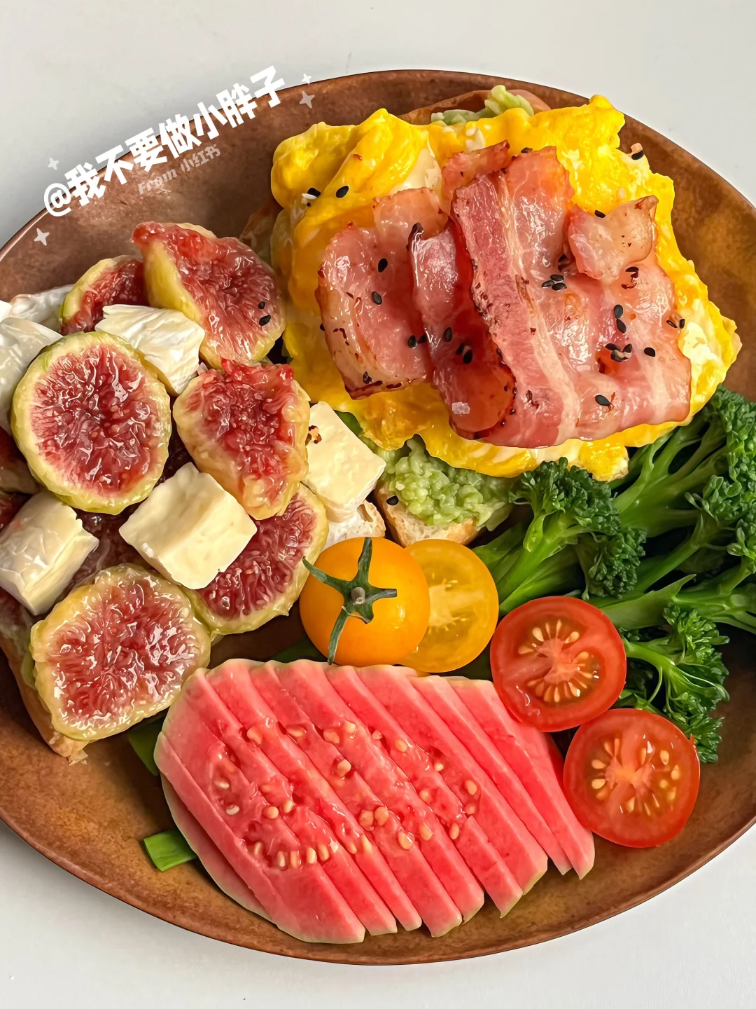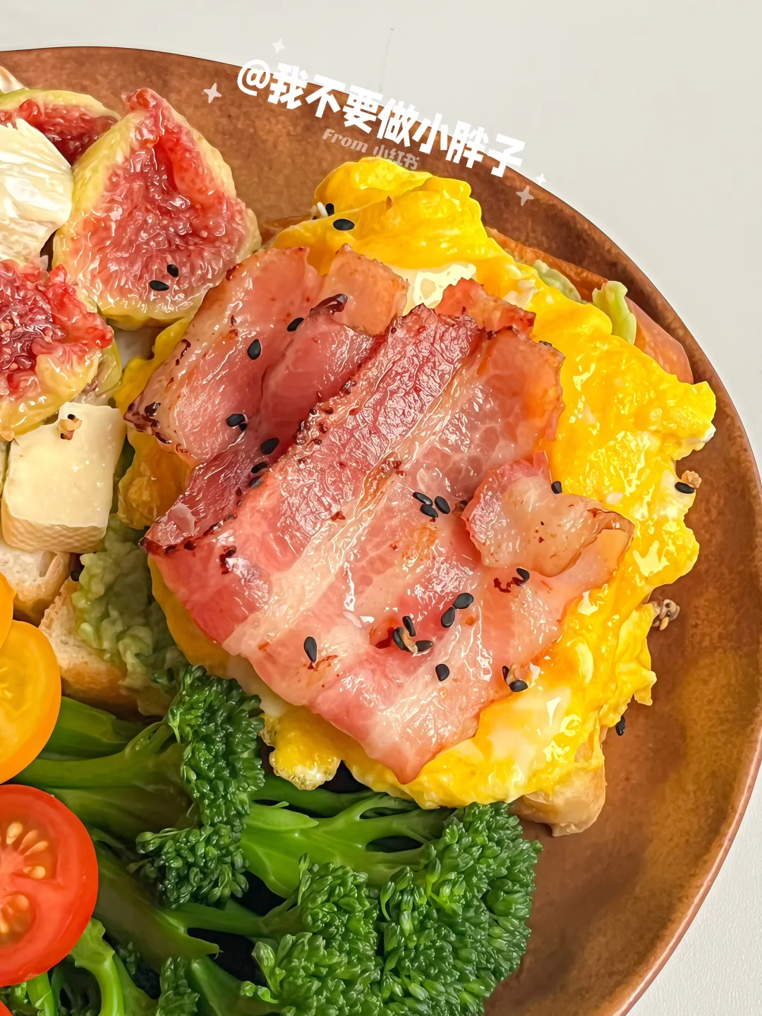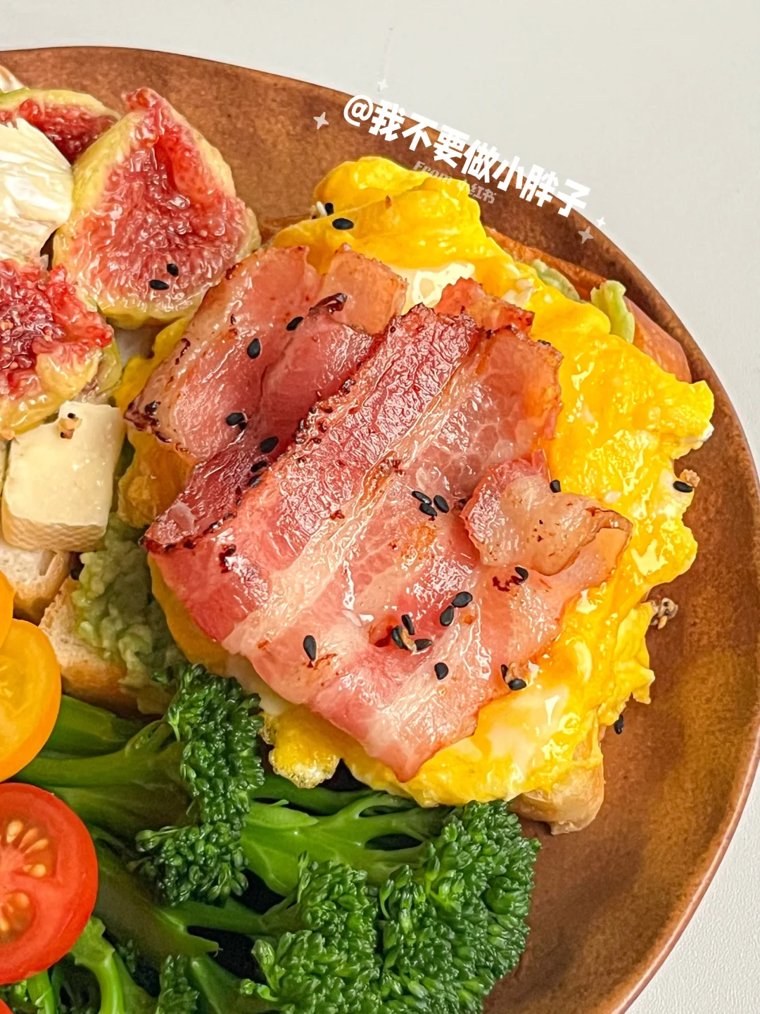 - ☕️ 冰拿铁 🍞 吐司+希腊酸奶+无花果+布里奶酪 🍞 吐司+牛油果酱+滑蛋+培根 🥦 西兰苔 芭乐 小番茄 - 软糯流蜜的无花果搭配吐司做成三明治真的太太太好吃了