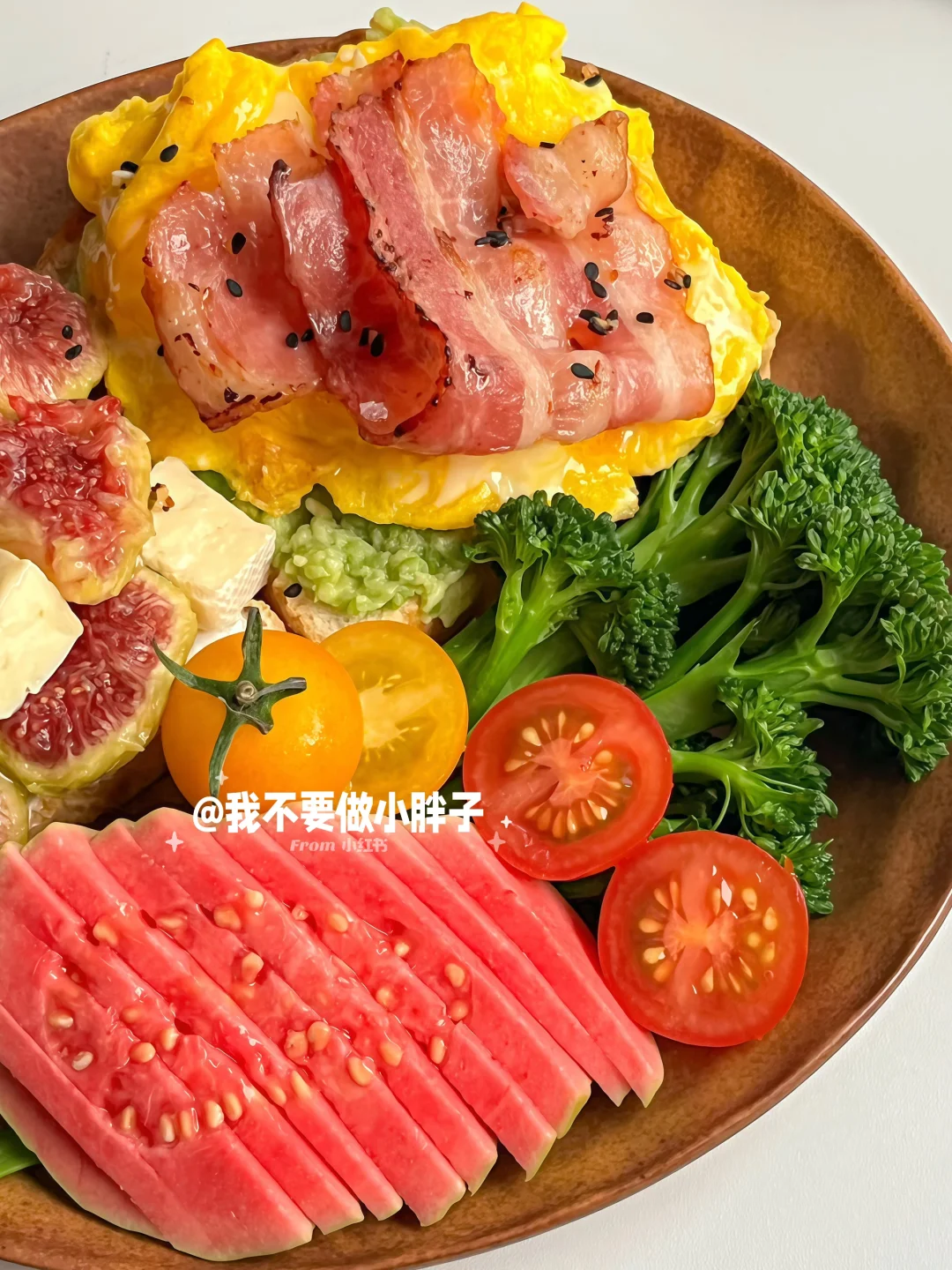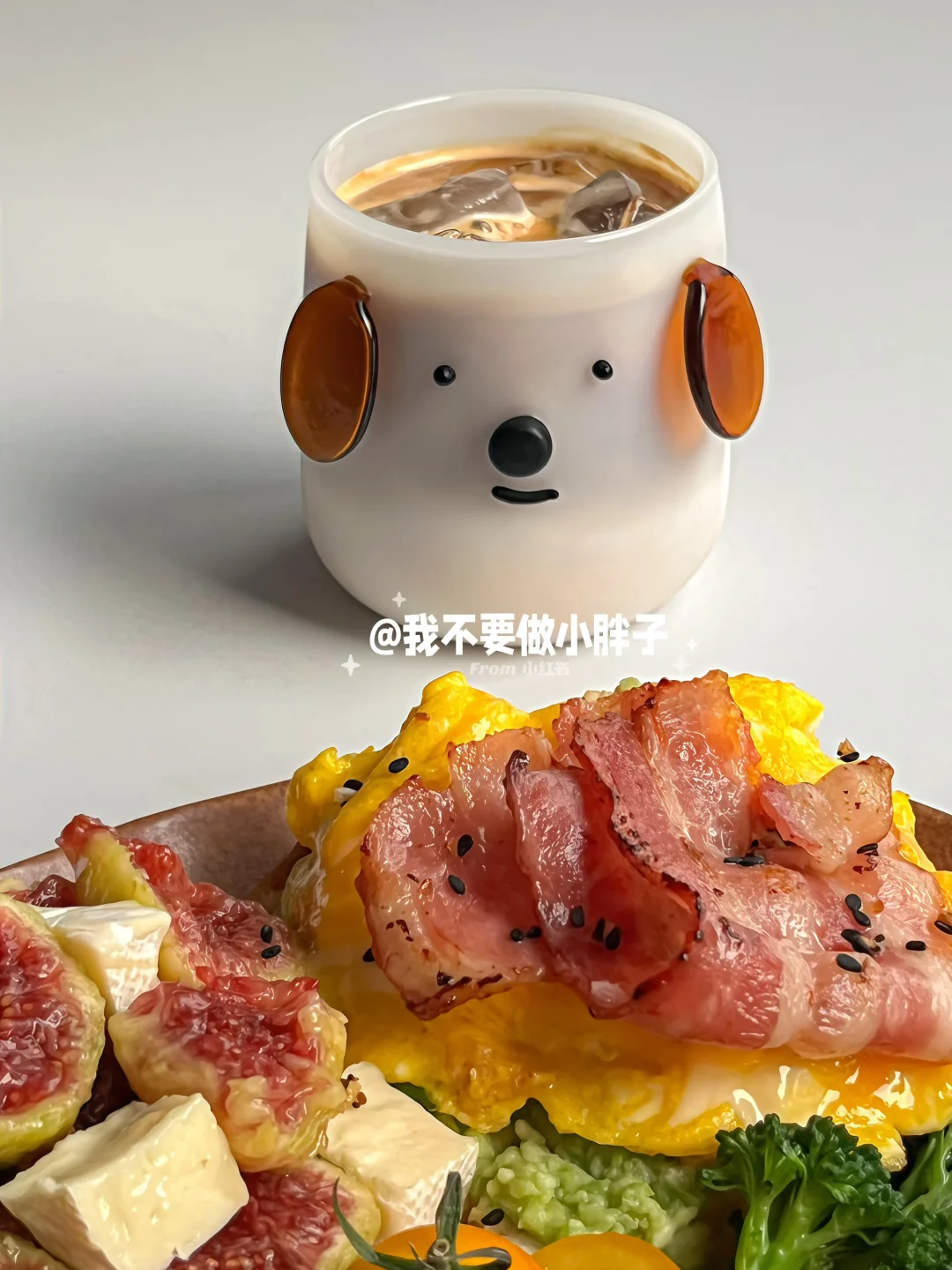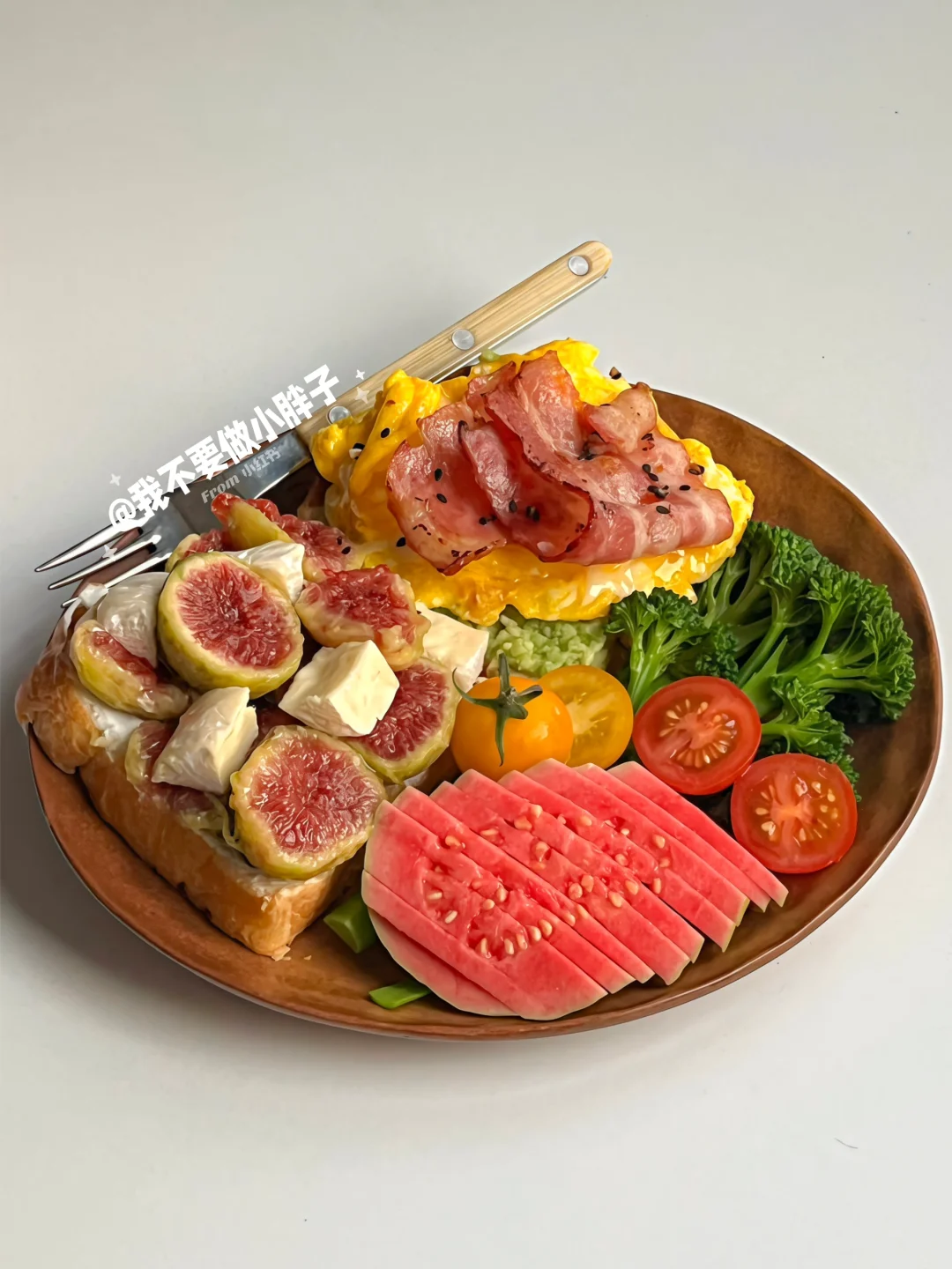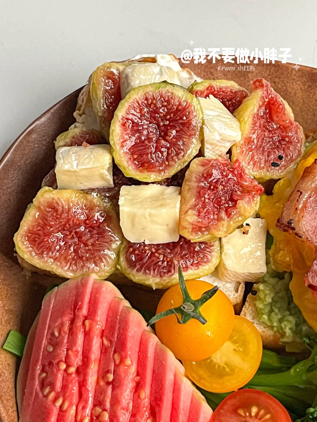 - ☕️ 冰拿铁 🍞 吐司+希腊酸奶+无花果+布里奶酪 🍞 吐司+牛油果酱+滑蛋+培根 🥦 西兰苔 芭乐 小番茄 - 软糯流蜜的无花果搭配吐司做成三明治真的太太太好吃了