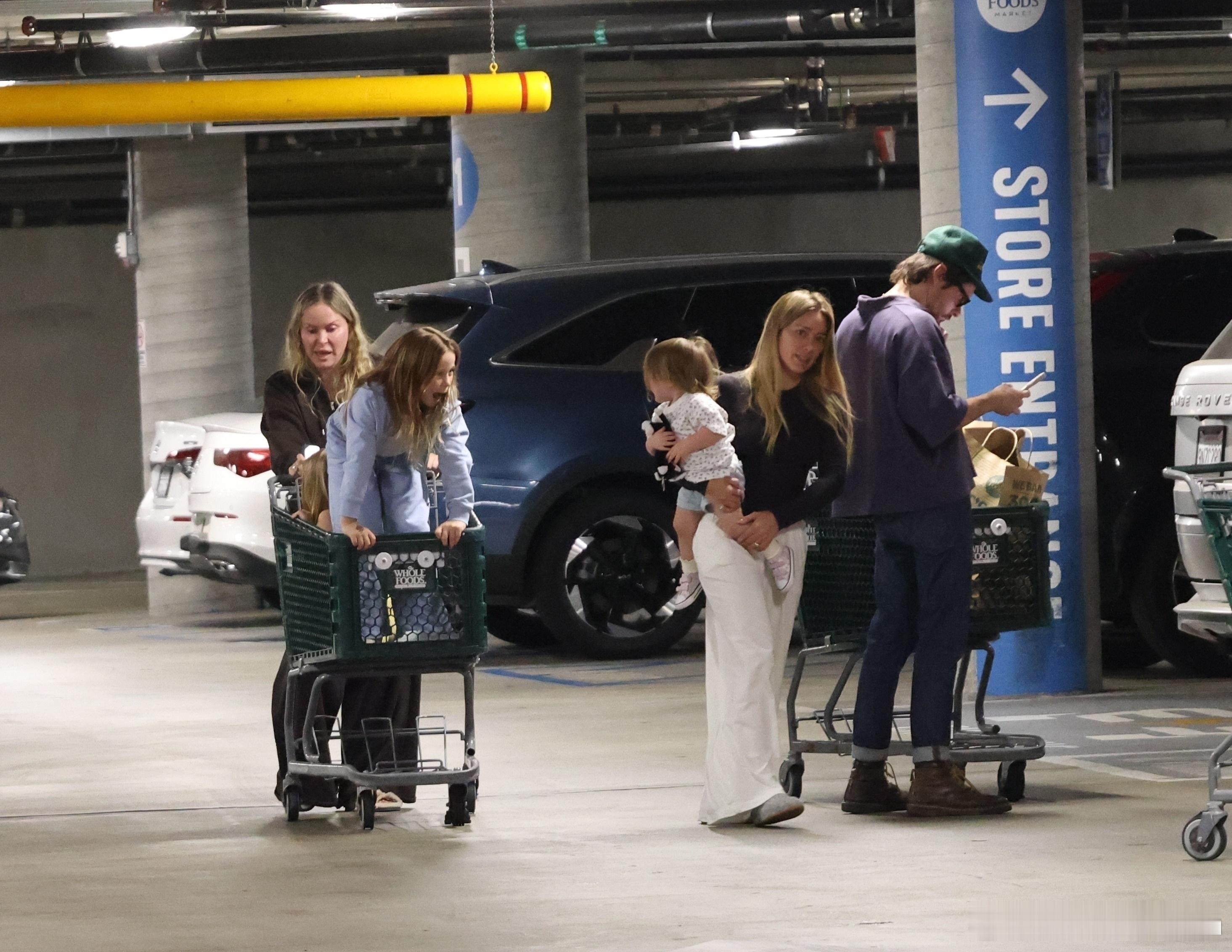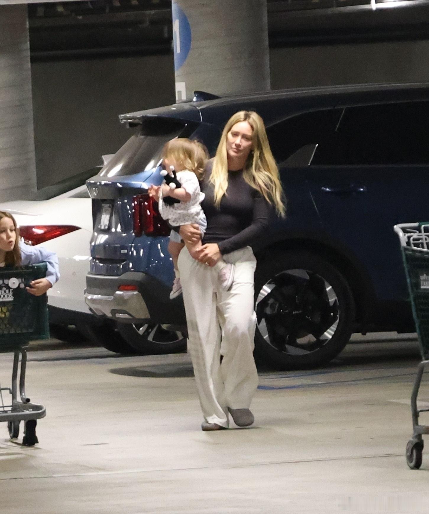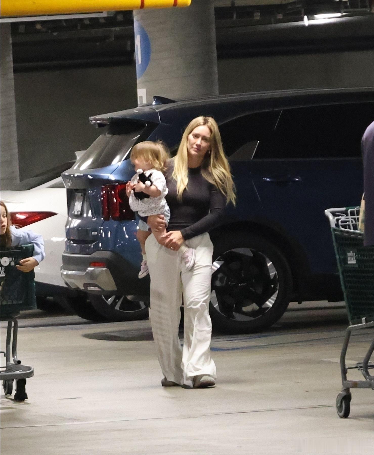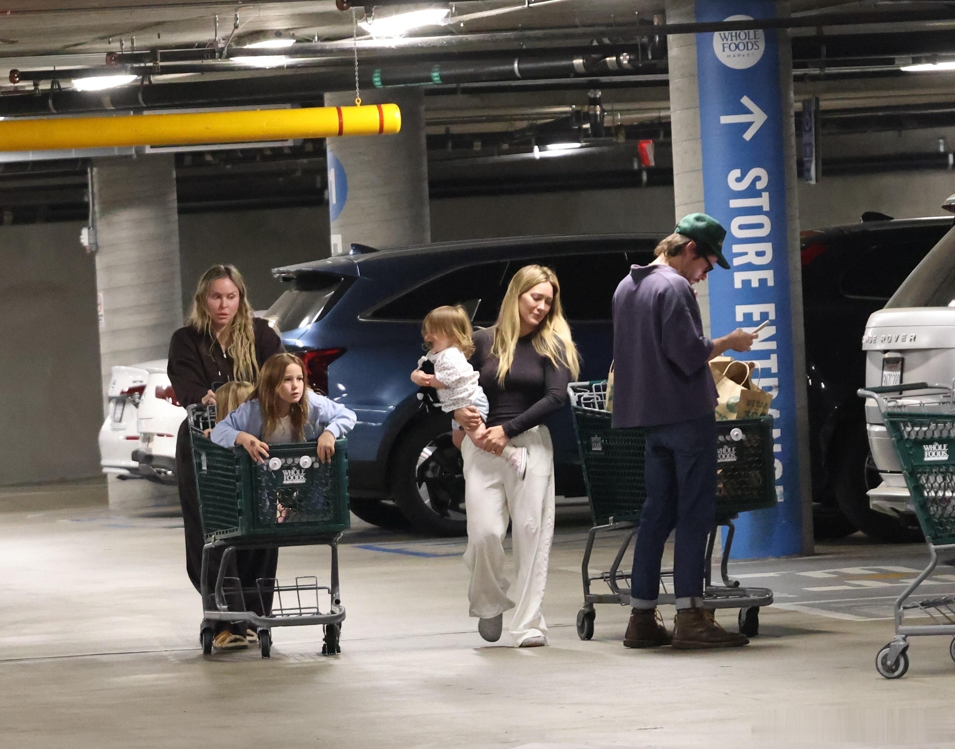 hilary duff希拉里达芙和老公Matthew koma带着三个女儿banks、mae和Townes在斯蒂迪奥城外出,购物后离开Whole Foods超市,达芙反向抱娃,好强