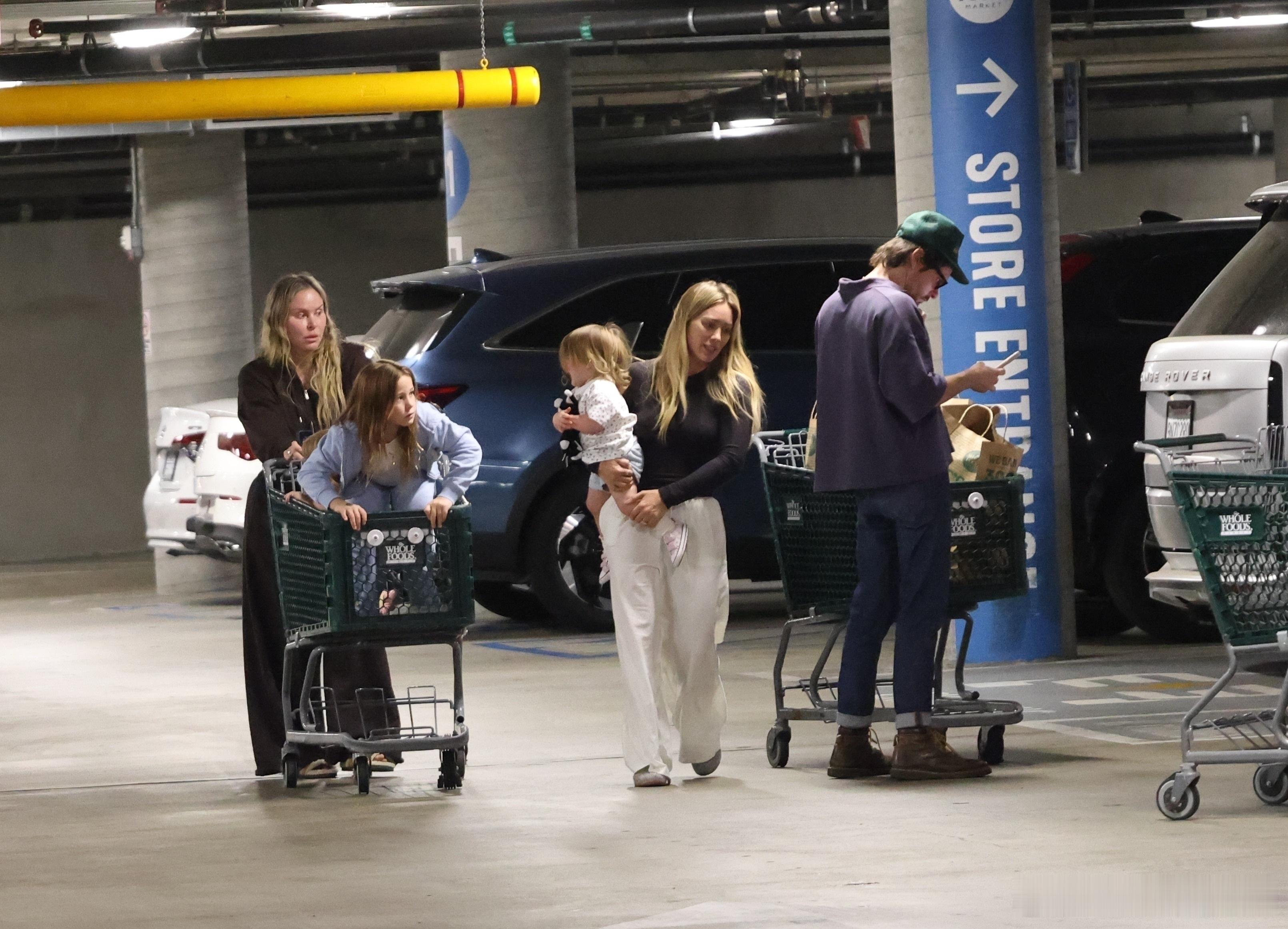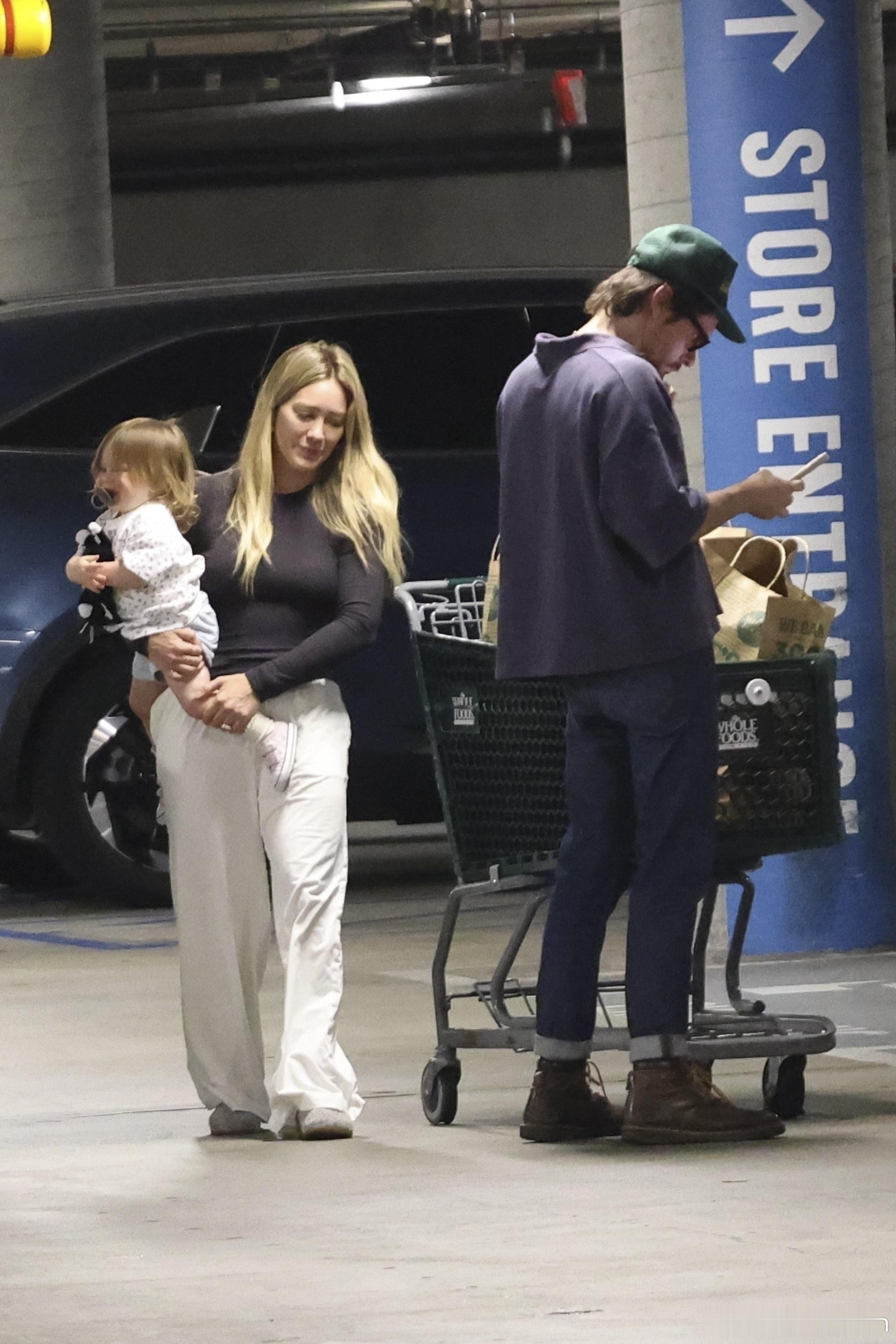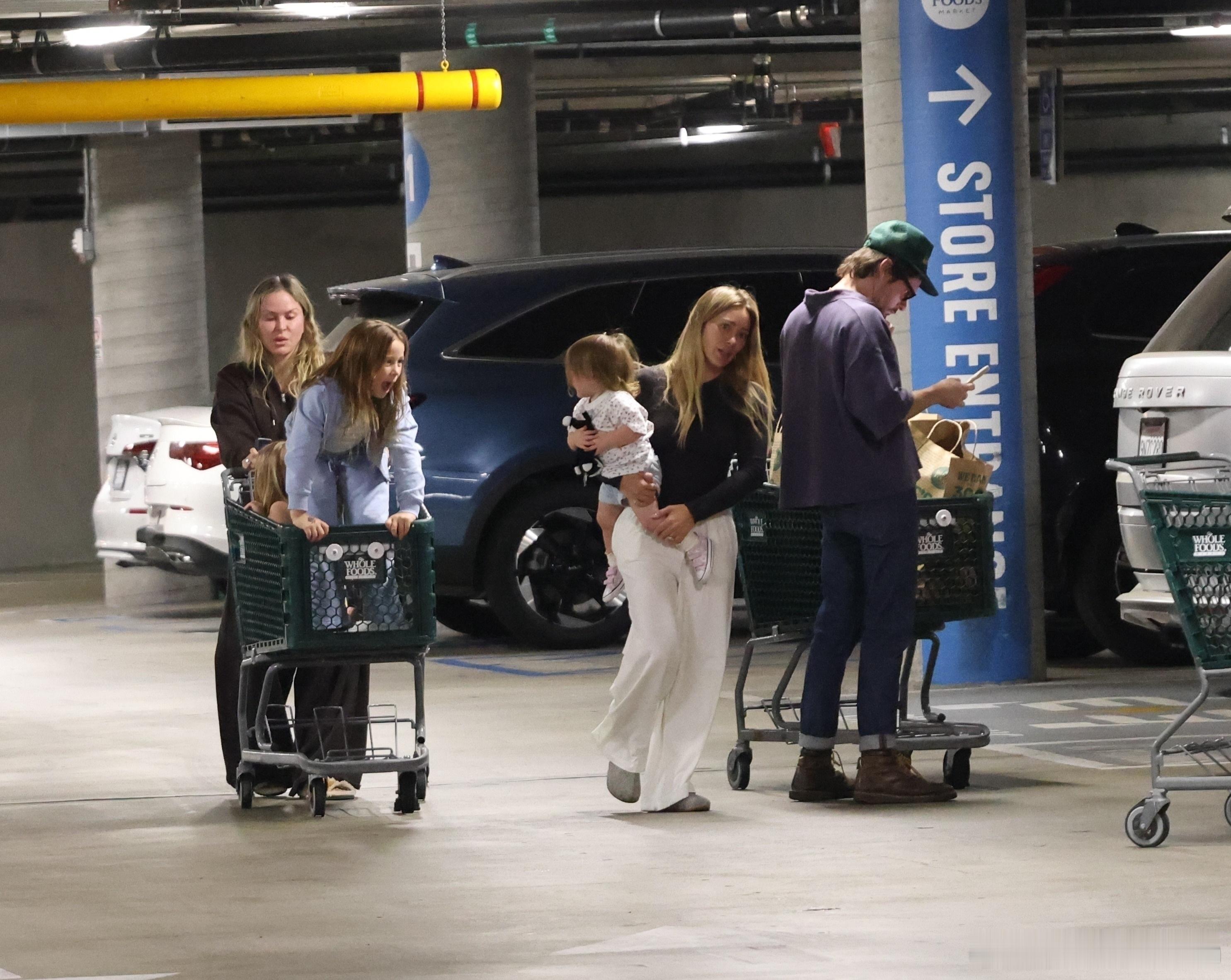 hilary duff希拉里达芙和老公Matthew koma带着三个女儿banks、mae和Townes在斯蒂迪奥城外出,购物后离开Whole Foods超市,达芙反向抱娃,好强