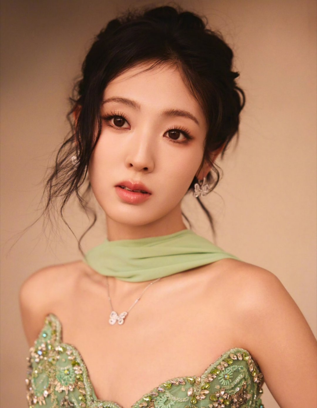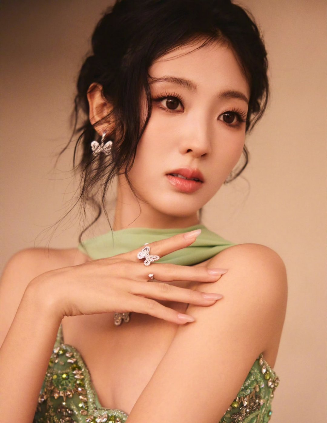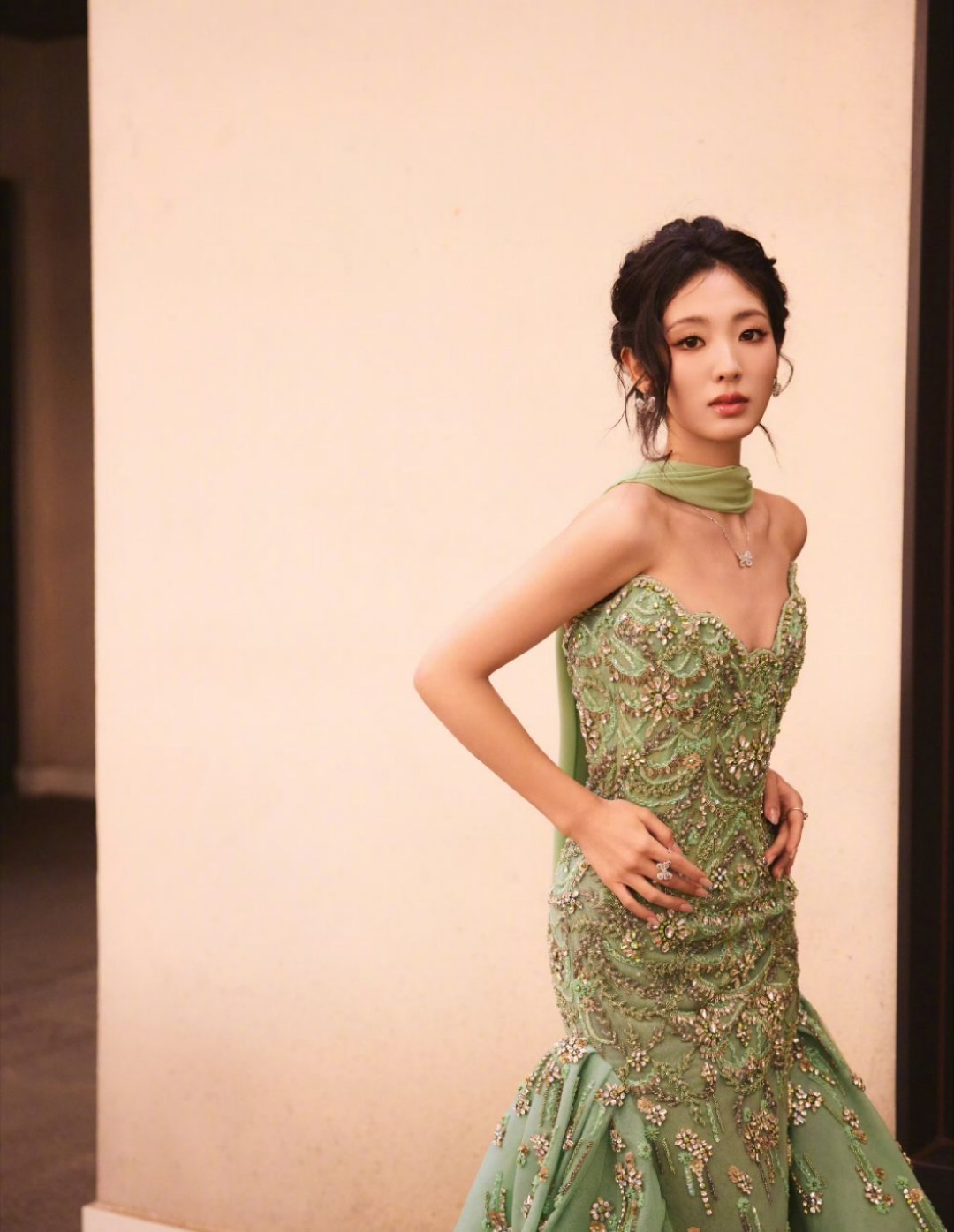 刑菲绿色礼服也很美哦~搭配卷发发型超级优雅!