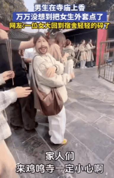 这就是缘分!江苏一男生去寺庙上香,想求一份姻缘,万万没想到,刚把香点燃,就把旁边女生的外套戳了一个洞!女生一回头,男生尴尬得不停道歉,女生大人有大量没有计较,网友:一位女大回到宿舍轻轻的碎了! 去寺庙求姻缘,结果姻缘没求到,先把旁边女生的外套戳了个洞!江苏苏州的小吴怎么也没想到,自己精心准备的 “祈福之旅”,会以这样尴尬又好笑的方式展开,更让他意外的是,这段小插曲被路人拍下来发到网上后,还引来了一大波网友调侃 “这就是传说中的‘破洞缘分’吧”。 事情发生在周末的苏州寒山寺,当天天气不错,来上香祈福的人比平时多了不少。小吴今年 26 岁,工作稳定但一直没遇到合适的对象,身边朋友总开玩笑说他 “缘分还没到”,这次专门抽时间来寒山寺,就是想诚心求一份好姻缘。出发前,他还特意查了攻略,知道上香时要保持专注,不能打闹,可没想到还是出了岔子。 上午 10 点多,小吴跟着人流来到大殿前的香炉旁,从包里拿出提前准备好的香,点燃后双手捧着,正要弯腰往香炉里插。可能是周围人太多有点拥挤,也可能是他太专注于许愿,手里的香不小心往前伸了一下,只听 “刺啦” 一声轻响,他赶紧抬头,发现自己手里香的火星,把旁边一位女生外套的袖口戳了个小破洞。 那是一件浅灰色的短款外套,破洞虽然不大,但在干净的布料上格外显眼。小吴瞬间慌了神,手里的香都差点掉在地上,他赶紧把香插进香炉,转过身对着女生一个劲道歉,声音都有点发紧:“对不起对不起,我不是故意的,刚才人太多没注意,你的外套多少钱,我赔给你吧!” 让小吴没想到的是,女生并没有生气,只是低头看了看外套上的破洞,笑着摆了摆手说没事,还反过来安慰他别紧张,说这件外套已经穿了挺久,偶尔有点小瑕疵也没关系。女生说话的时候语气很温和,脸上带着浅浅的笑意,这让原本特别尴尬的小吴稍微放松了一点,他又连说了好几声谢谢,还主动提出要帮女生买杯奶茶赔罪,不过女生婉拒后就跟着朋友一起离开了。 虽然女生没计较,但小吴心里还是有点过意不去,他站在原地愣了好一会儿,连原本要许的愿都忘了一半。更巧的是,当时旁边有位游客正好拍到了这一幕,视频里小吴紧张道歉的样子,和女生笑着摆手的画面形成了鲜明对比,这段视频被发到网上后,很快就火了。 网友们的评论五花八门,有人调侃小吴 “求姻缘的方式太特别,这是用破洞开启缘分副本吧”,还有人注意到女生离开时的细节,开玩笑说 “看女生的反应,说不定心里还觉得有点可爱,一位女大回到宿舍轻轻的碎了,可能在偷偷回味这段小插曲呢”。 后来小吴在评论区回复,说自己当天回家后还在懊恼,早知道就多注意一点,不过也很感谢那位女生的大度,让他没那么尴尬。他还调侃道,虽然这次求姻缘没直接有结果,但也算有了一段特别的经历,说不定这就是缘分的另一种打开方式。 现在,这段视频还在网上被大家讨论着,很多人都说,这样的小意外虽然有点尴尬,却充满了生活里的小趣味,也让原本严肃的祈福场景多了几分烟火气。对此,你们有什么看法,欢迎评论留言~