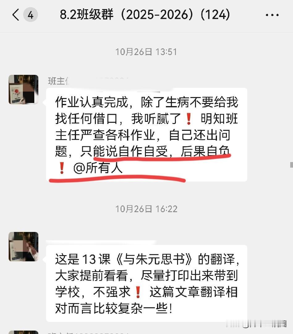 初中班主任又在班级群里叨叨了,基本上每次都会说什么“自作自受后果自负”之类的话。说实话,我快忍不住了。每次我都是最后一个回复“收到”,也只有这样表达我的抗议了。 我跟孩子聊过她们班主任,她说班主任很强势。体育篮球不让报,只让报乒乓球和足球。也不知道是什么原因。 孩子说班主任还不止一次说过“”不要举报,举报也没有用,她教育局有人,道上也有人。谁举报就收拾谁。” 我不知道真假,如果是真的,我真的会举报她。