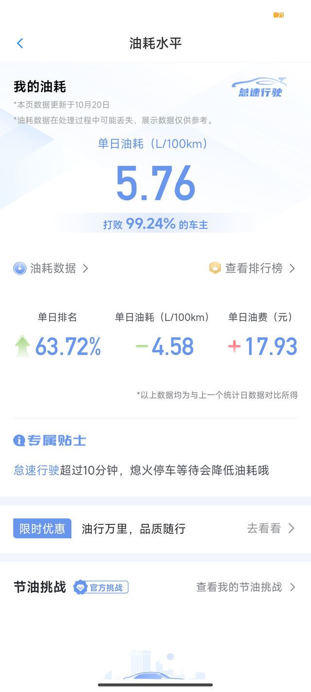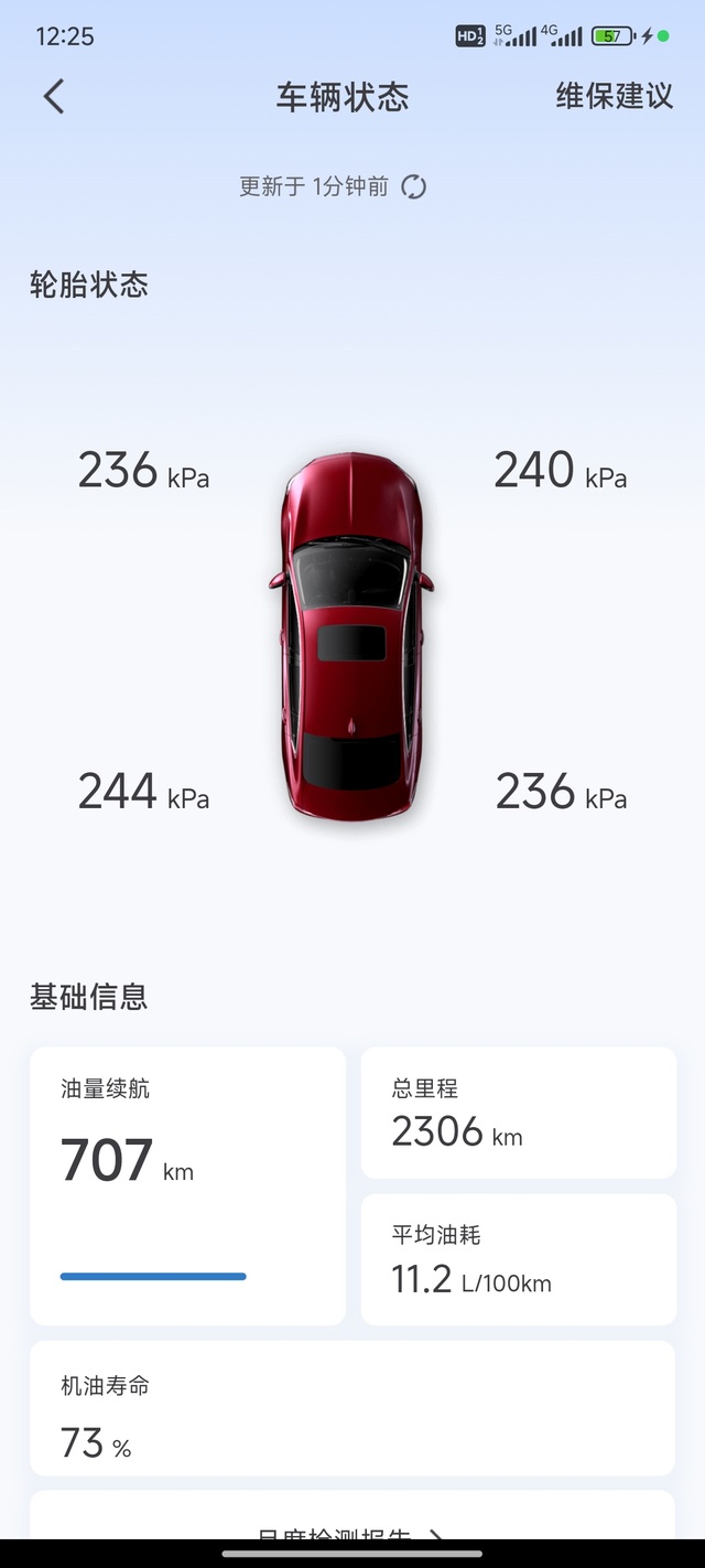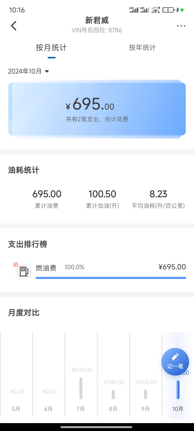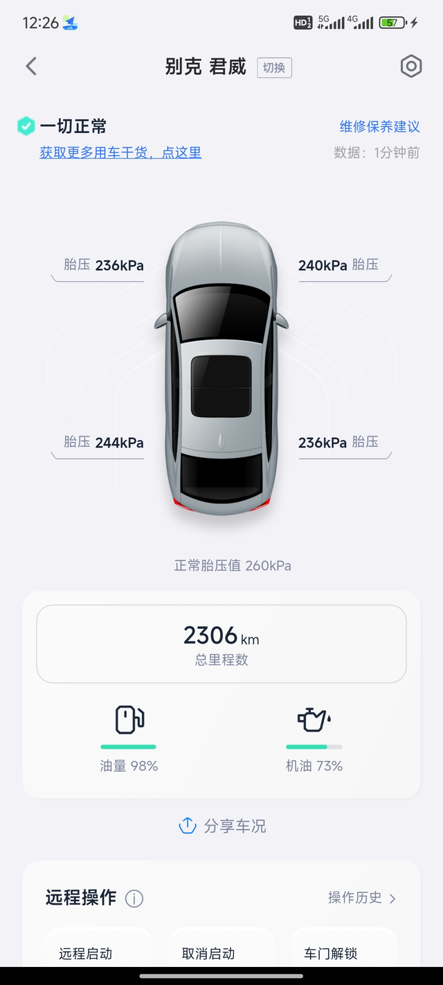 24款28T君威提车一百天真实油耗分享 24年7月12日提的车,至今满百天了,今天和大家分享一下自己的真实油耗。 先说一下总里程吧,目前提车到现在跑了2300多一点里程,主要是没啥事,整体我老婆开上下班,每天两个来回大概每天大概12公里,单边距离3公里的市区工况,总得来说市区油耗高一点,反正我和老婆都很满意油耗的,毕竟那3公里的路有十来个红绿灯,跑不起来。2300公里的路程有150公里左右是十一放假跑的高速,所以我感觉我的油耗可能比其他车主的要高一点。 大概算了一下,买车三个多月,跑了五箱油,2.0T的都是加95的油,加油费油合计是1841元。昨天加油时的公里数是2282公里,合计下来就是8毛钱左右一公里。记住,我这是买车到现在的总计综合油耗,大概是8毛一公里哦,这样合计下来的话大概每公里的油耗是在11个左右。我看了一下那安吉星和别车APP的总油耗平均也基本一致。没多少误差。 记得刚开始的时候,第一箱油是提完车就加满的,第一箱油很费油,合计不到一块钱一公里,第二箱油也是不到一块钱一公里,从电箱油开始后,油耗能明显感觉降了。五箱油,从第一箱油的450公里左右增加到第五箱油的650公里实际续航。 等短时间想去跑跑高速拉一下油耗,大概再跑一千多公里去,估计油耗还能明显降低点。说实话,我感觉就现在的油耗来说的话真算不太高吧,反正我是看了好多人对别克的映像就是油老虎,包括我自己以前也是这么认为的,可是实际自己买了之后才发现,别人说的油耗高的十个人里面至少又70%的是没有别克车的,甚至有90%的没有新款别克车的。别人说的闲话不可信,包括我说的我这24款28T的君威油耗,这油耗只是我自己的油耗,仅供参考,具体的油耗的话还是要看路况然后再来个黄金右脚。 说归说,闹归闹,认真说来给参考。2.0T的机头喝95号油,我的油耗真心的能接受。因为我12年的江淮和悦1.5自吸的,喝的92号油目前十二年多的车子了,油耗也大概6毛一公里了,现在和悦已经退休了,主要任务就是周末带我钓鱼了 这就是我这百日君威的真实油耗分享,等首保过后有时间的话会再次和大家分享分享油耗及其他问题。 目前开的小毛病没发现什么,上次过了个路牙石,感觉底盘发动机被磕到一下,然后开去朋友那升起来看看,结果发动机自带个护板,好像是树脂的那种材质,本来还想着加护板,没想到自带了护板,还好有护板,被磕到没发现任何问题后来才知道24款28T的君威好像都是自带发动机下护板。目前的话最不满意的就是君威大灯散光,不聚光,没有透镜。各位车友对大灯这块有没有像我这样的感觉。